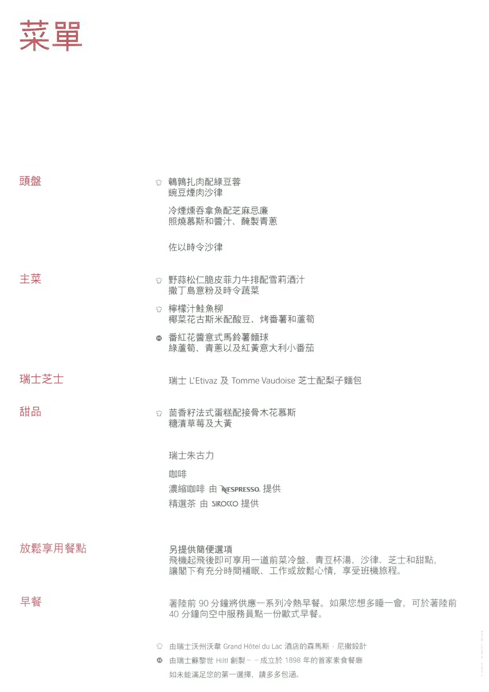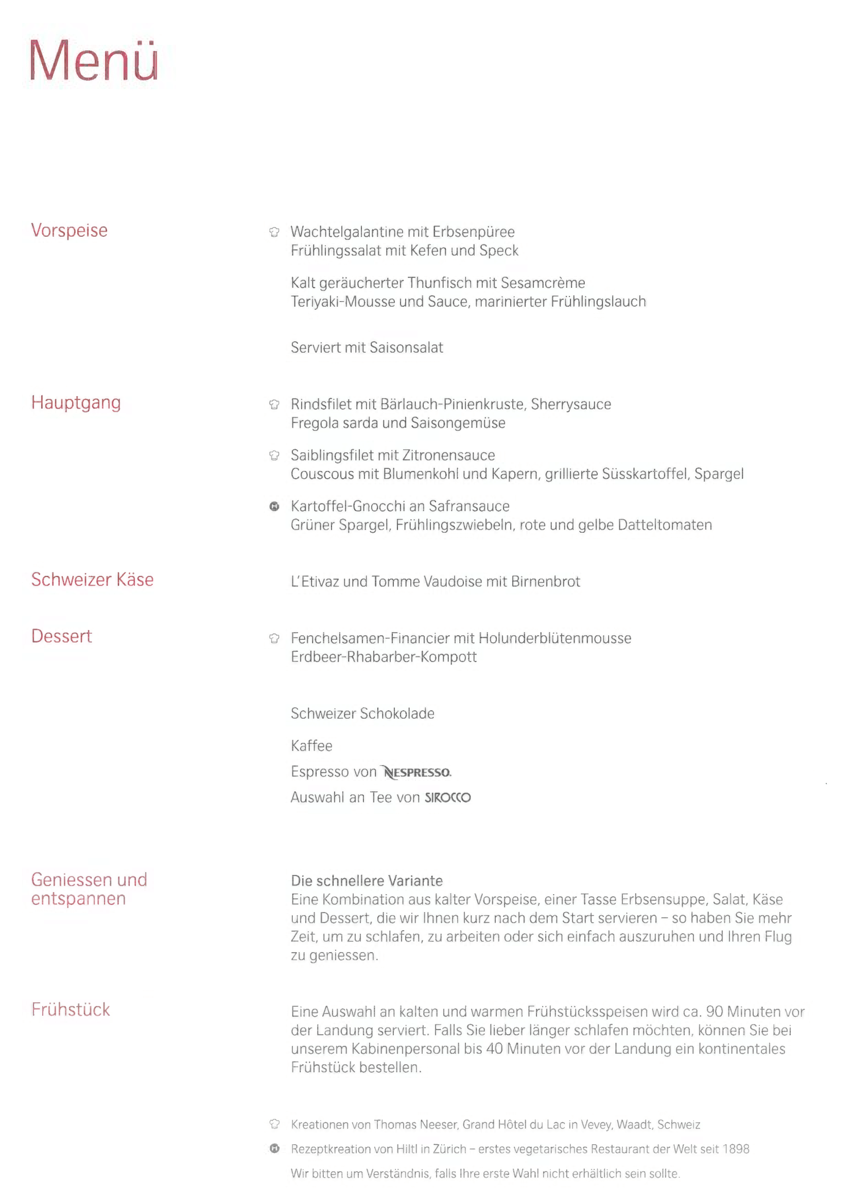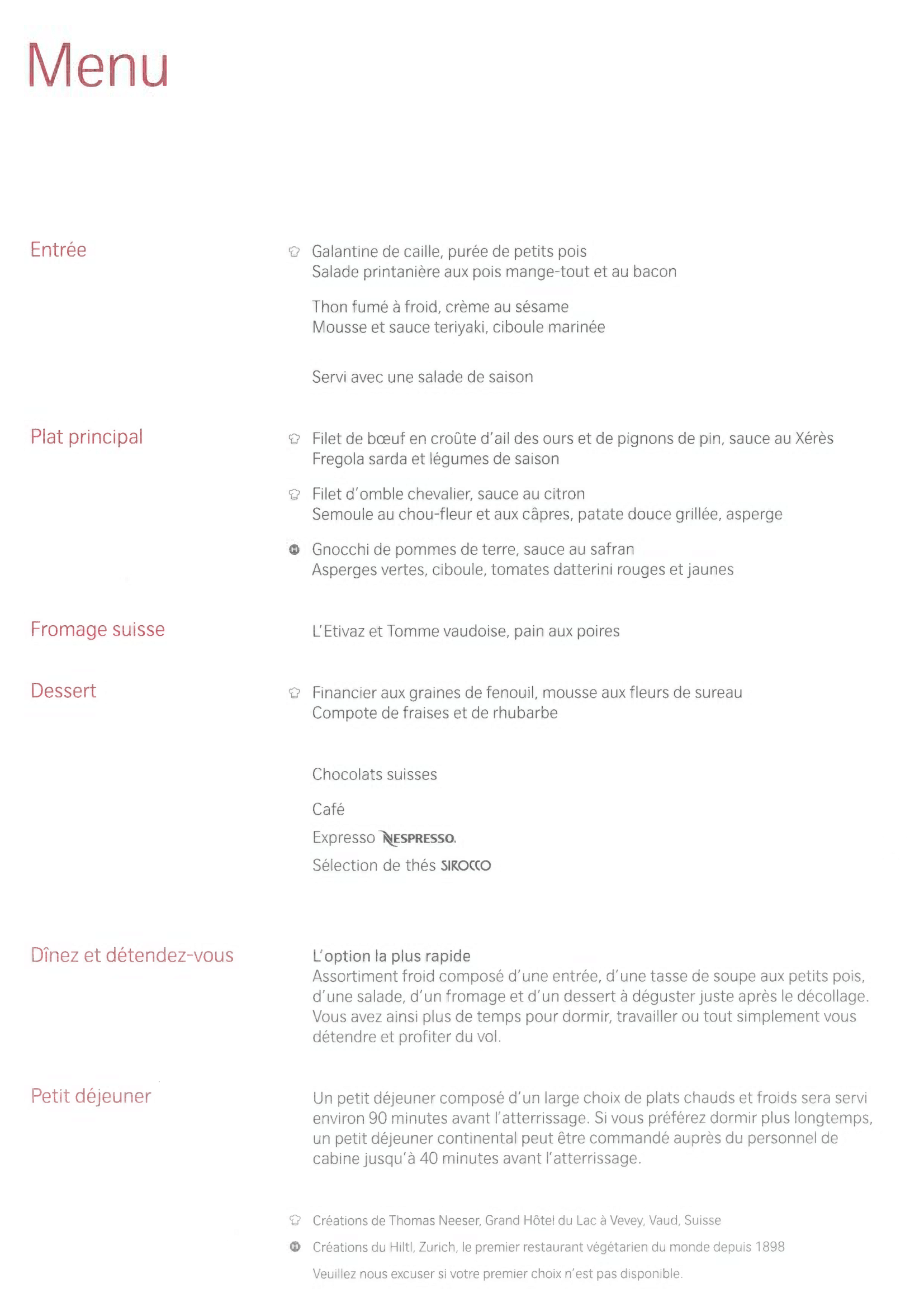 Swiss 777 business class – Welcome drink and menu