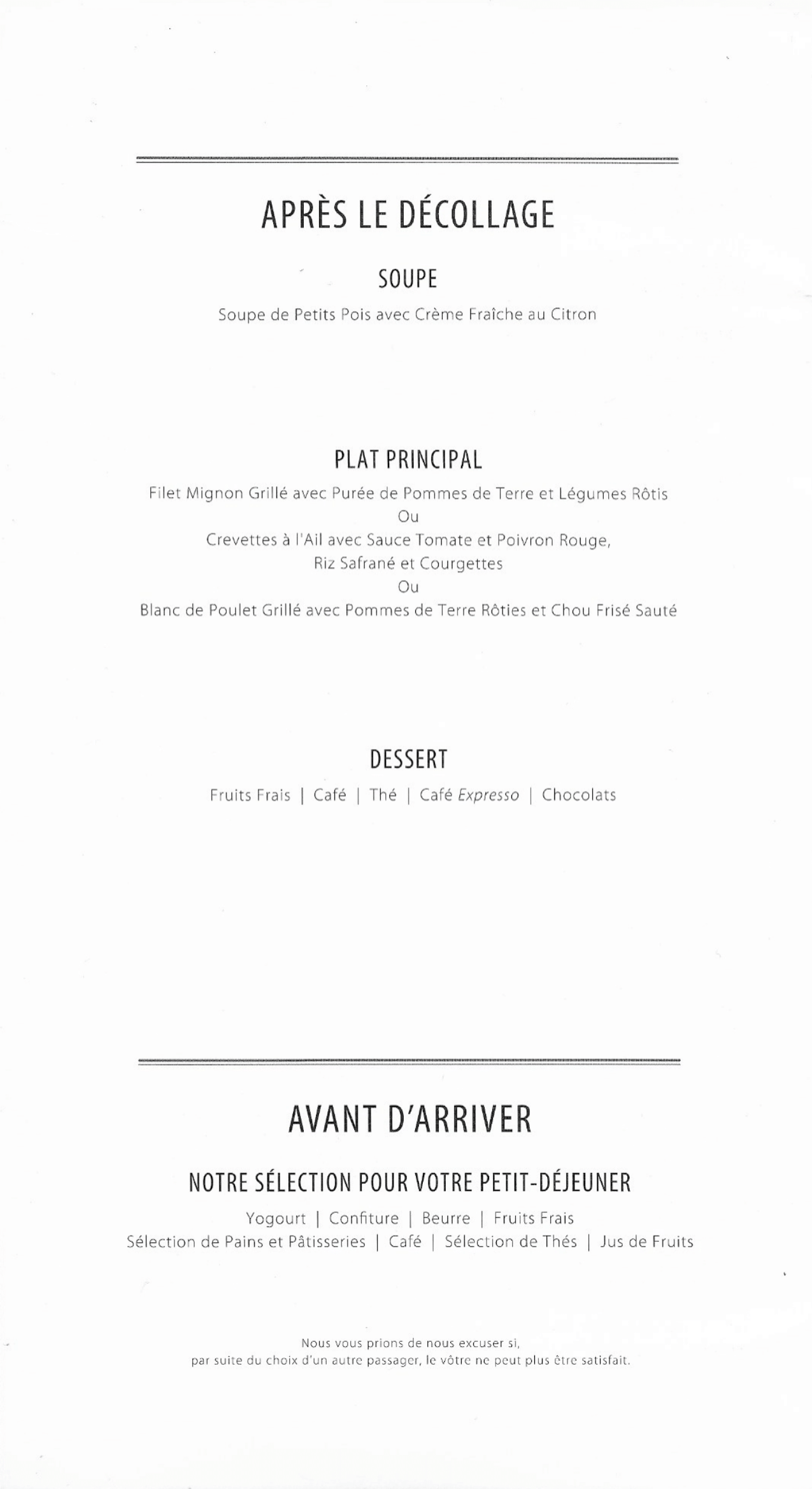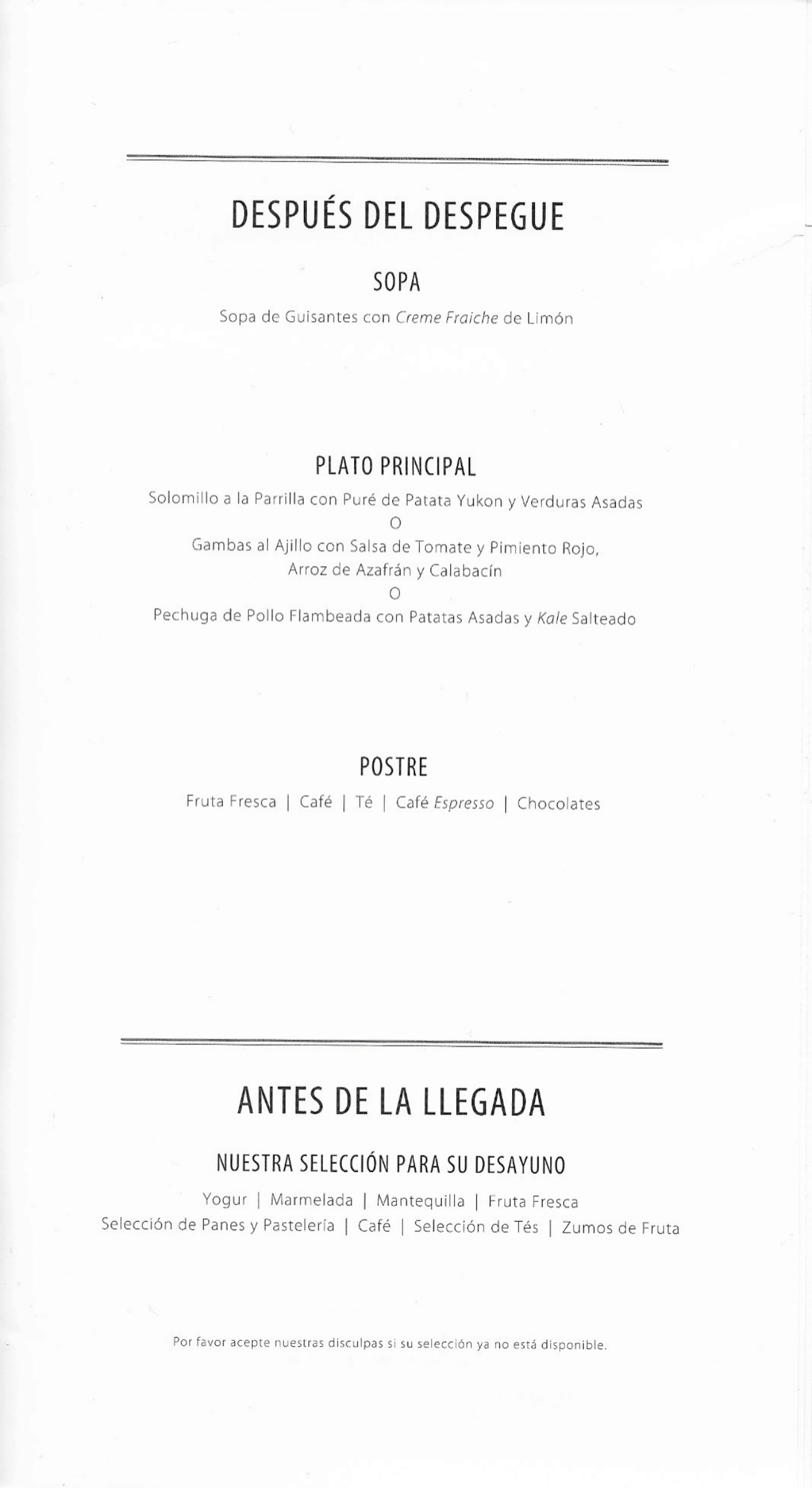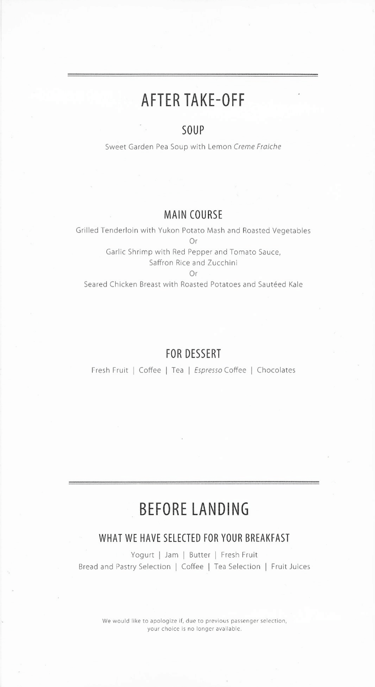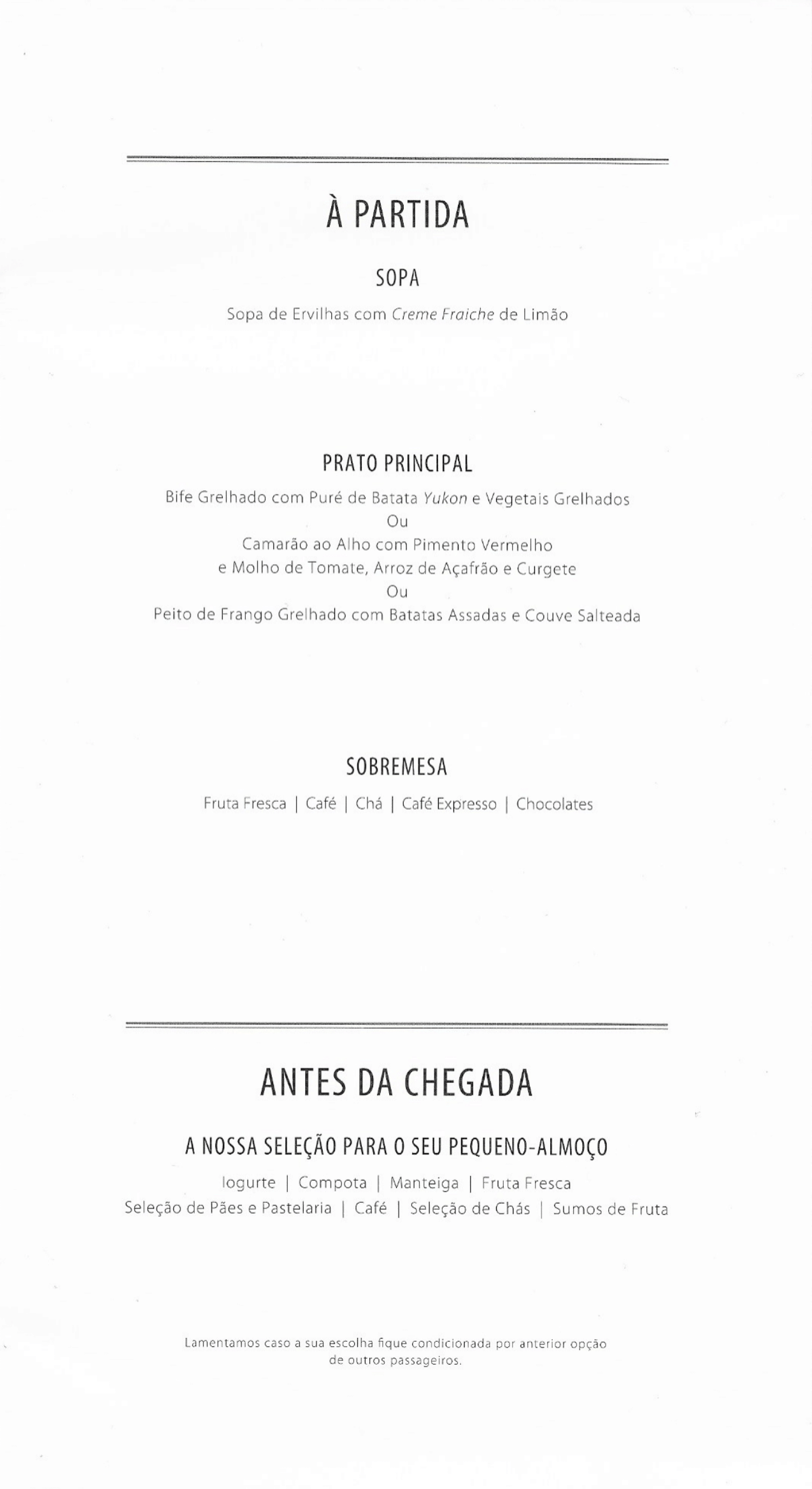 TAP Air Portugal business class – Menu