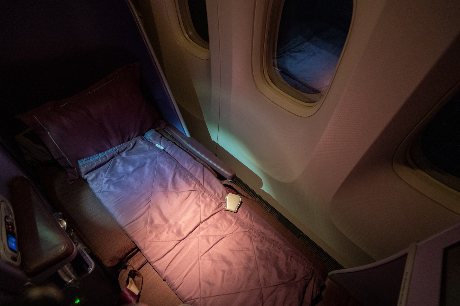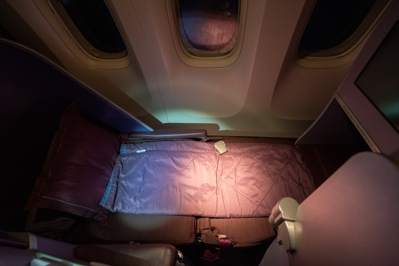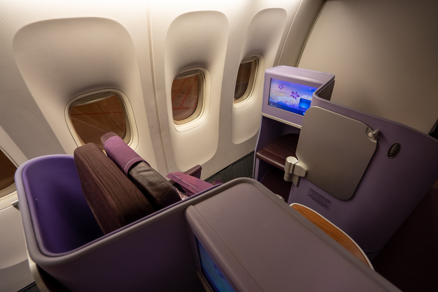 This was my first time flying long-haul with Thai Airways in business class, although I had flown the airline once before on a regional short-haul flight. I was familiar with the cabin from last time around, but it was nice to see the distinct purple cabin once again.