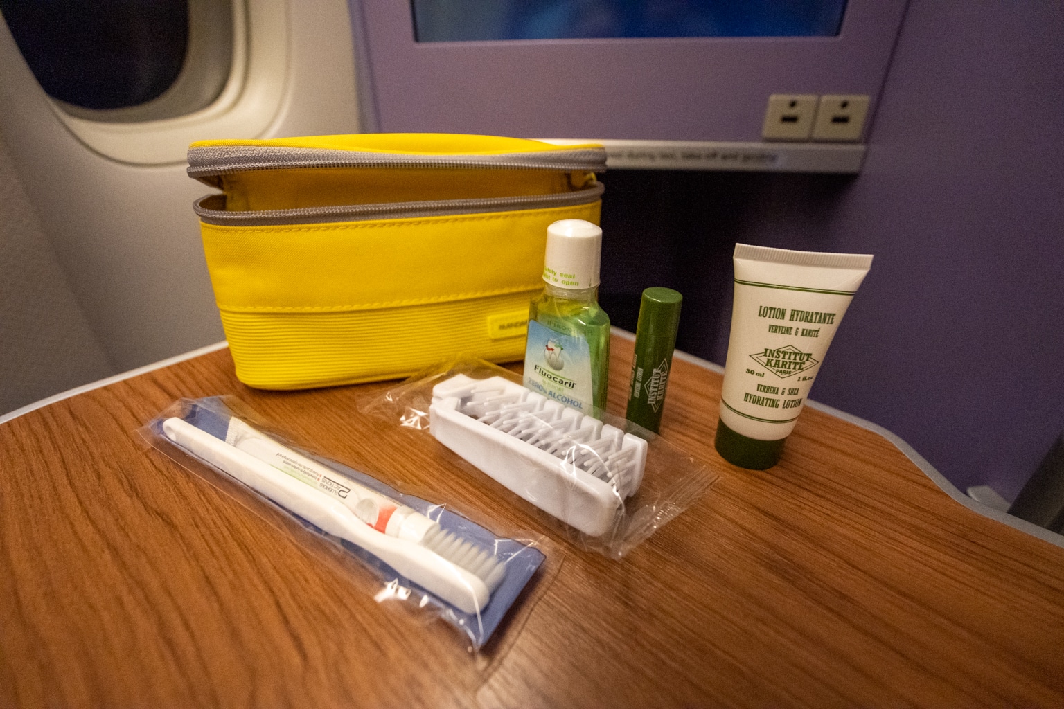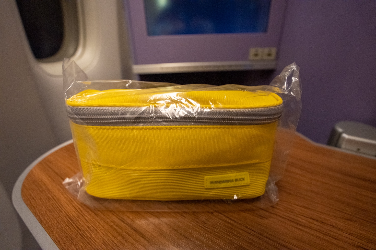 On this flight, a bright yellow Mandarina Duck amenity kit awaited each passenger at their seat.