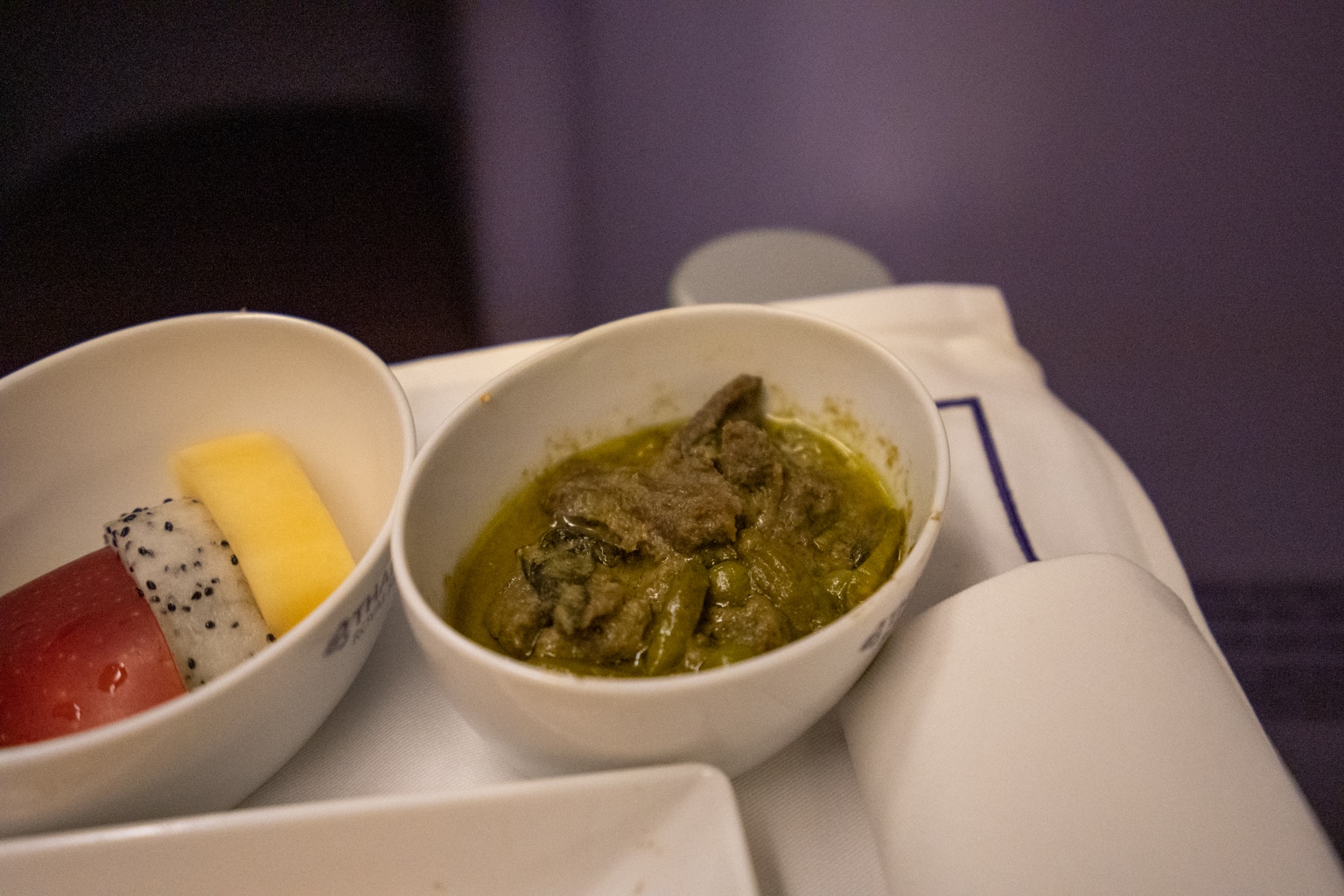 For the main course, there was a choice between Thai beef curry and a Western fish dish served with a cream sauce. I opted to try the Thai beef curry, always looking to sample an airline’s native offerings whenever possible.