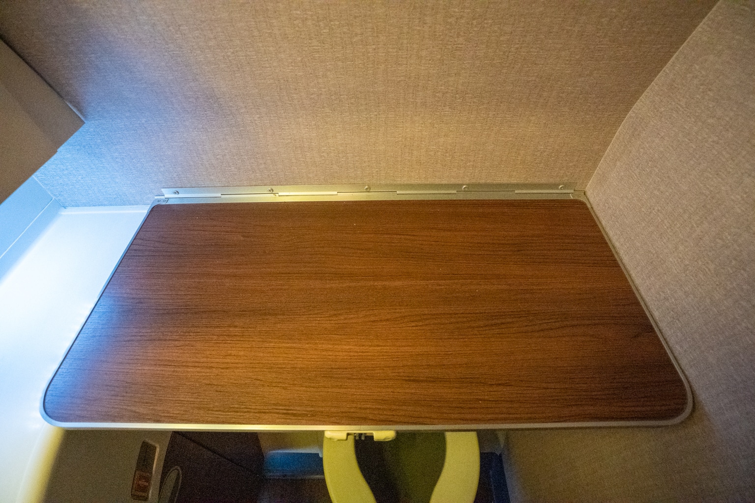 To the right of the entertainment screen, the table tray is exposed and sits flush against the seat shell – not the most elegant placement for the table tray when not in use.