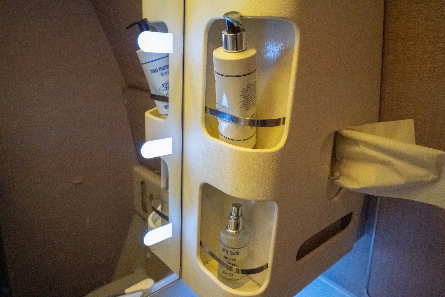 Thai Airways’s business class restrooms on the 777 are fairly conventional, with a baby changing table and a few amenities like hand lotion and perfume.