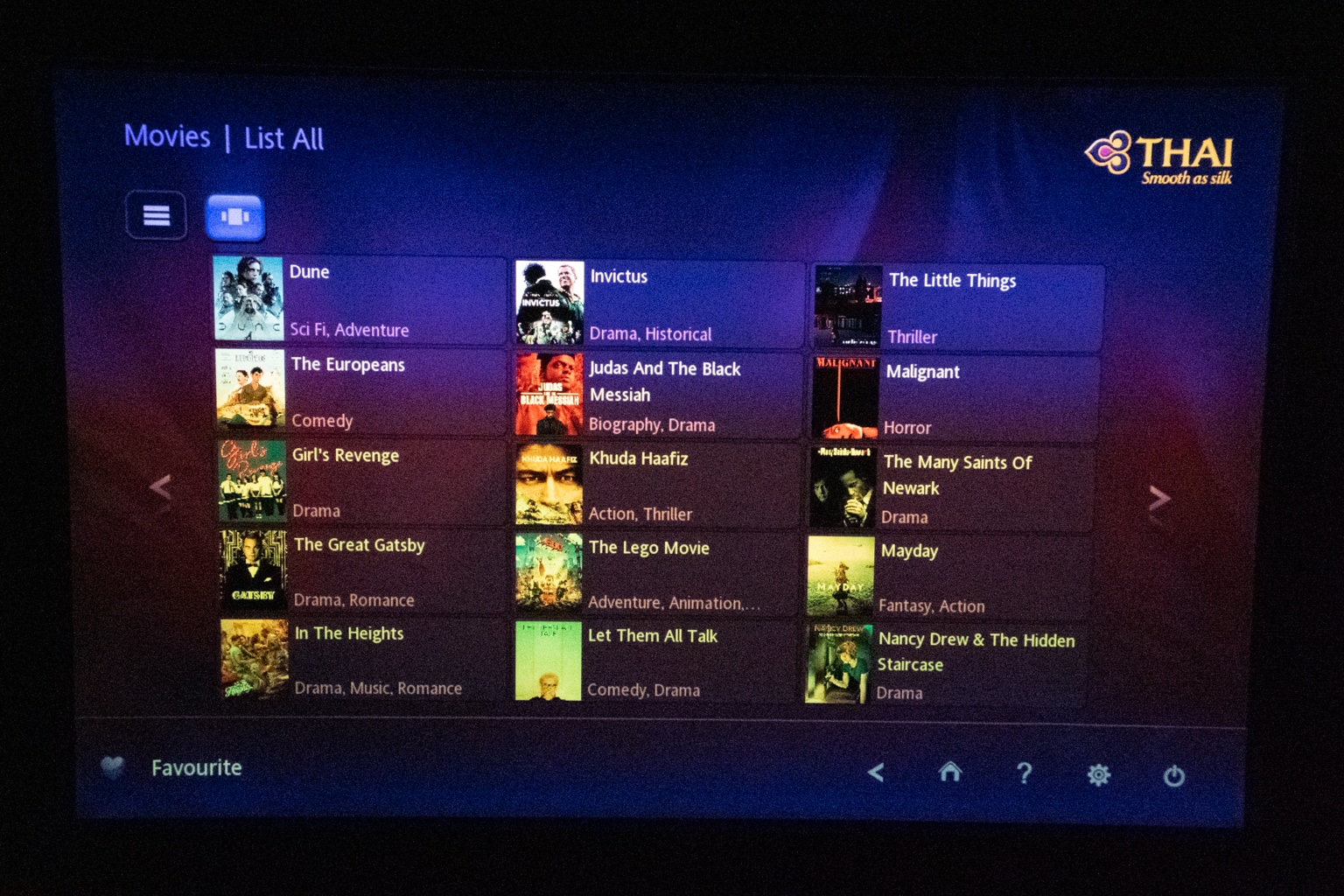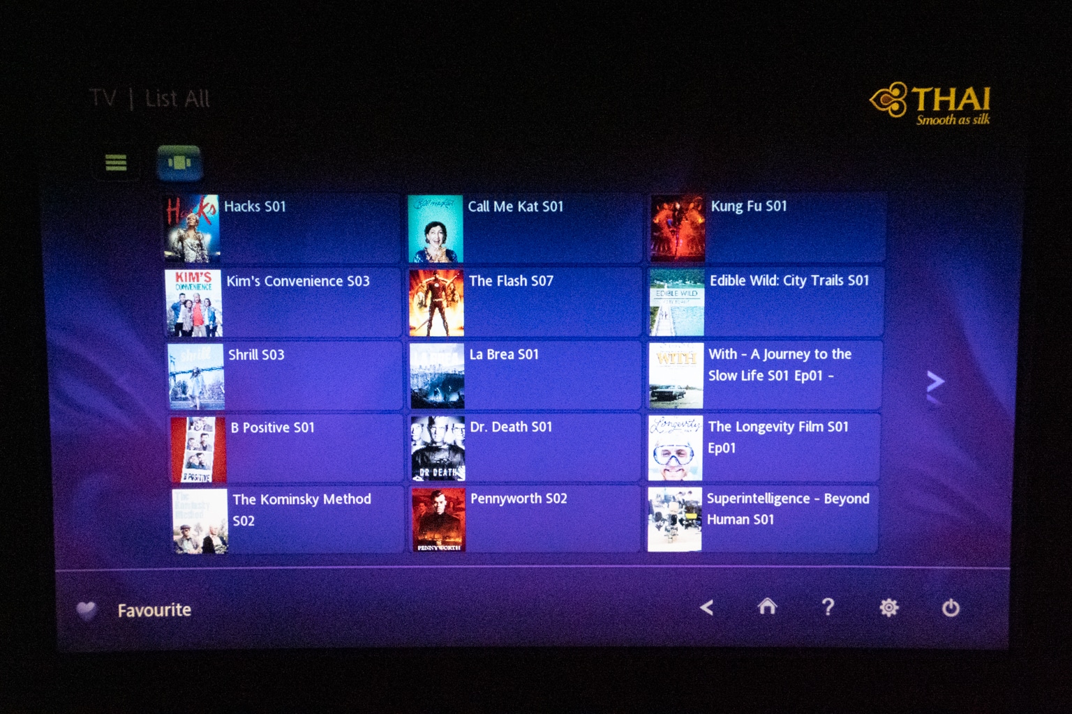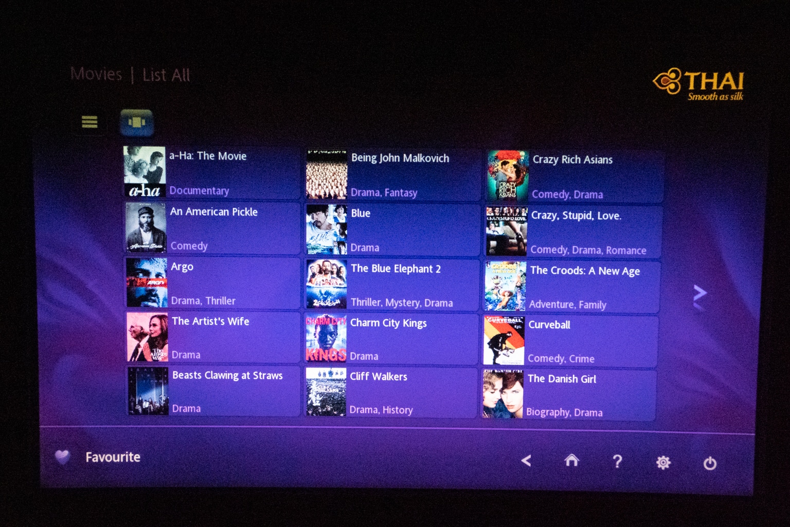 The Thai Airways in-flight entertainment system features around 40 movies and 20 documentaries, a series of TV shows, and a few kids’ movies. The movie selection is limited to mainstream Hollywood and a handful of Asian options.