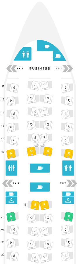 There are a total of 42 business class seats arranged in a staggered 1-2-1 configuration. The cabin is divided into a main business class cabin of 24 seats and a mini-cabin of 18 seats.