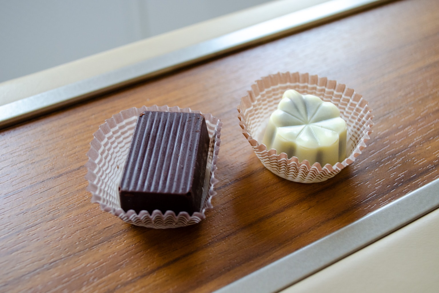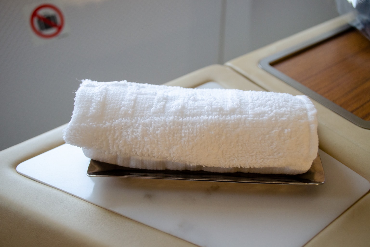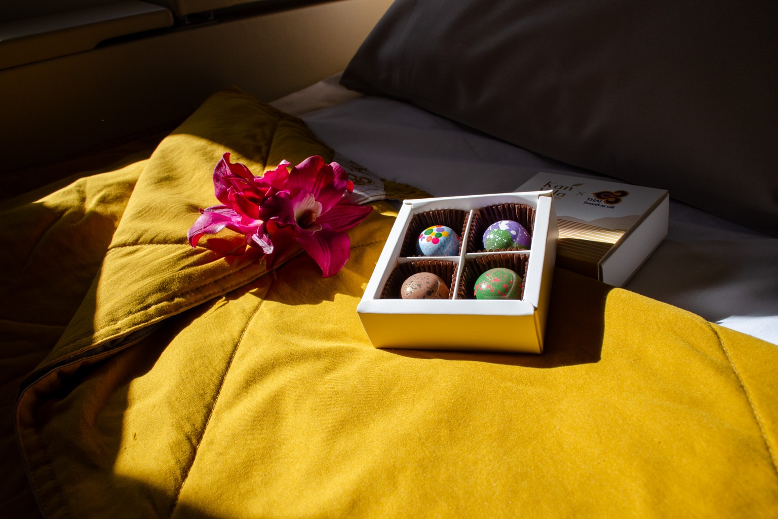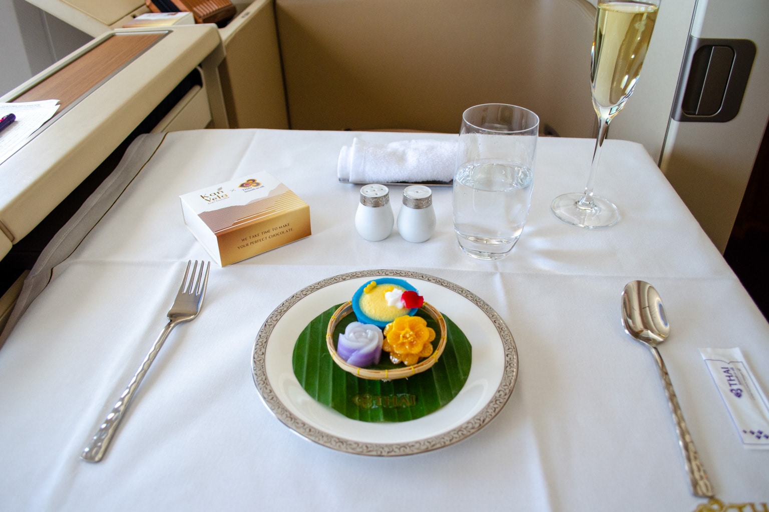 Then, I was presented with two decadent chocolates to enjoy alongside the bubbles, as well as a box of Kan Vela craft chocolate, which I gladly accepted. Shortly thereafter, a warm towel was handed to me to round out the pre-departure service.