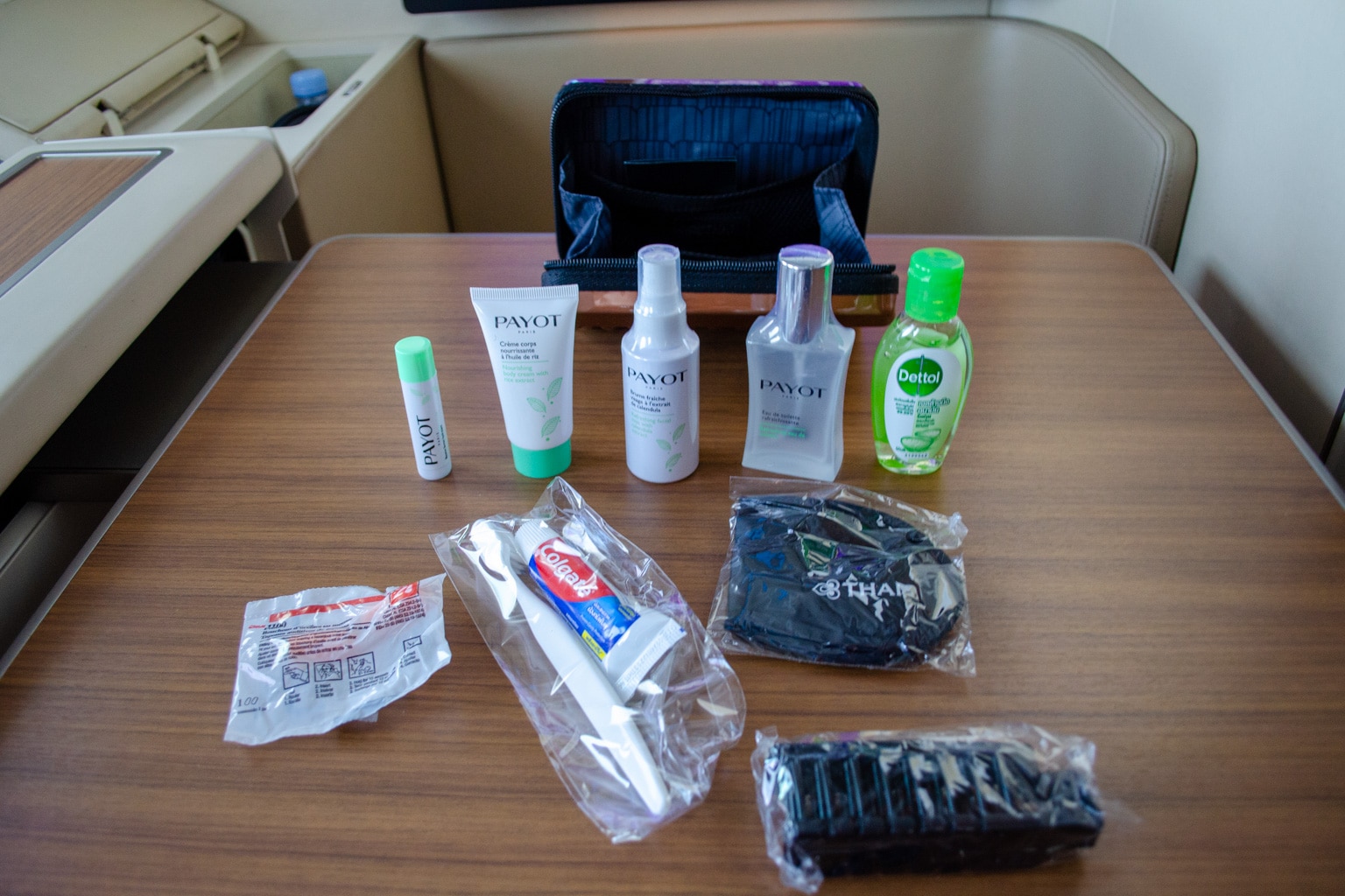 Inside, it came jam-packed with contents, including a toothbrush and toothpaste, a comb, an eye mask, ear plugs, and mouthwash. In addition, there were four Payot skincare items: lip balm, cologne, moisturizer, and mist.