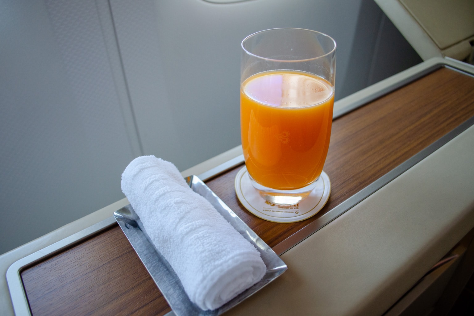 Inspired by Ricky’s beverage of choice on planes, I ordered a glass of mango juice, which was made all the more refreshing with an accompanying towel.