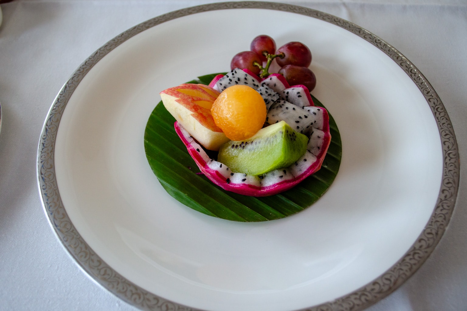 Next came a beautifully cut and arranged fruit plate, consisting of dragonfruit, kiwi, cantaloupe, apple, and grapes.