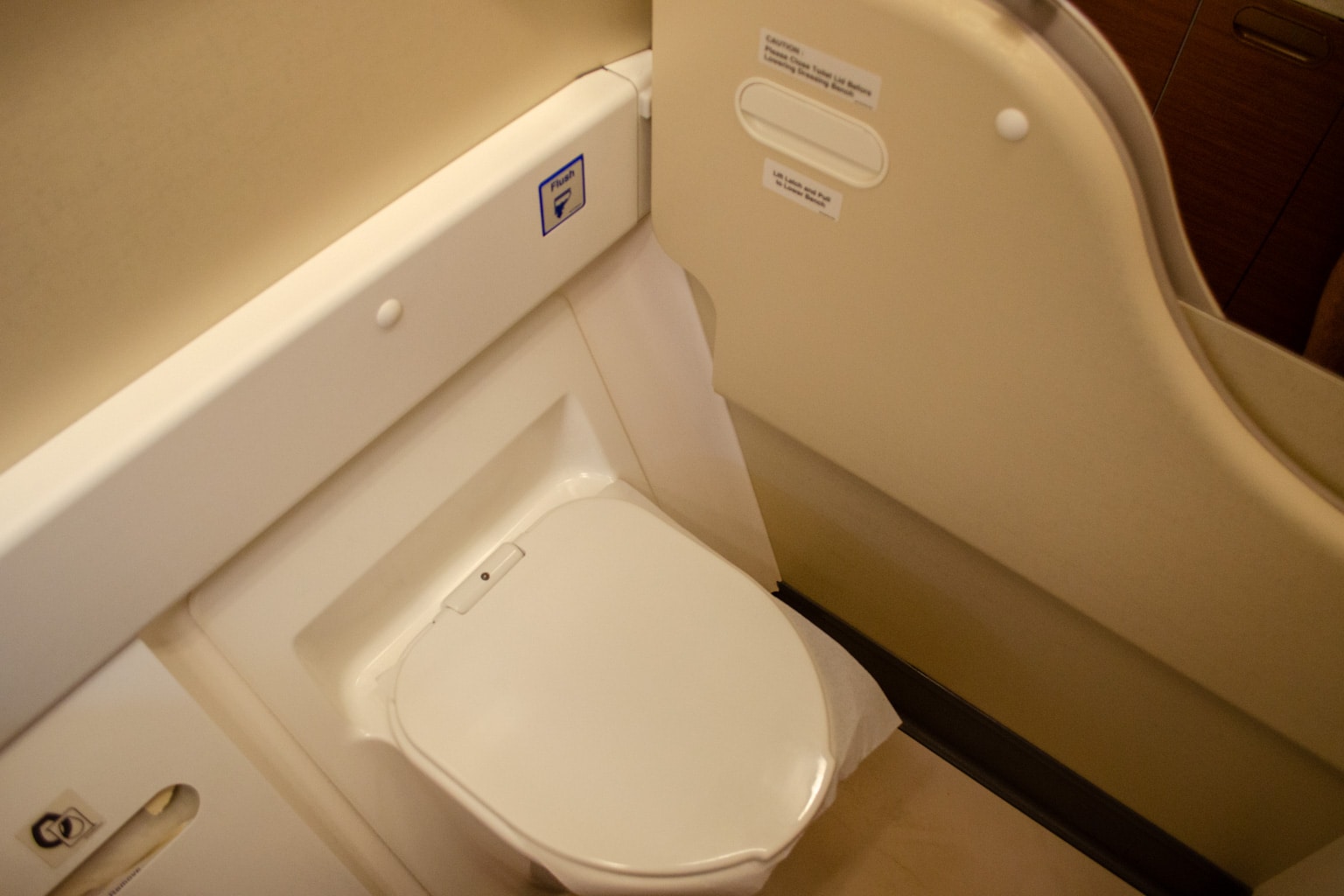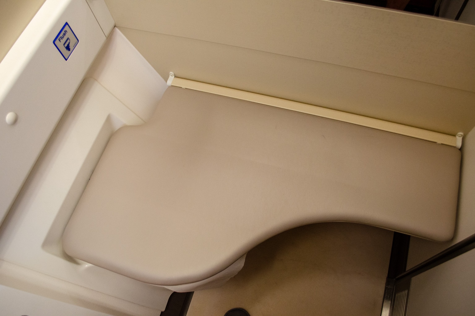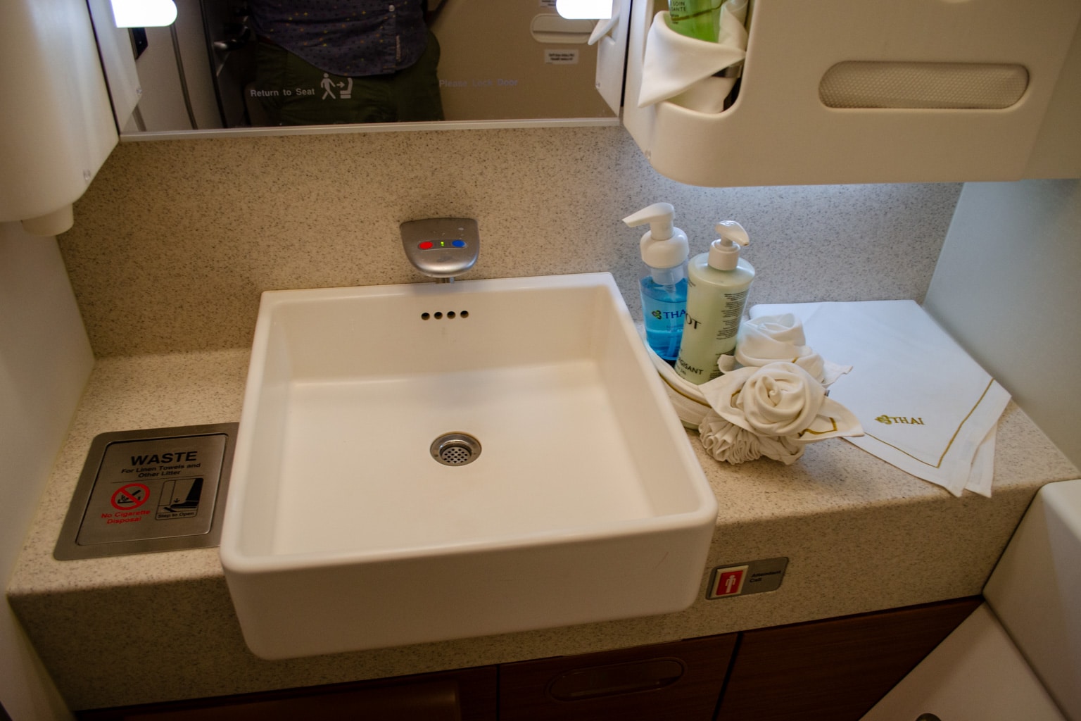 With a full belly and over half of the flight remaining, I headed into the restroom to freshen up before lying down for a bit.