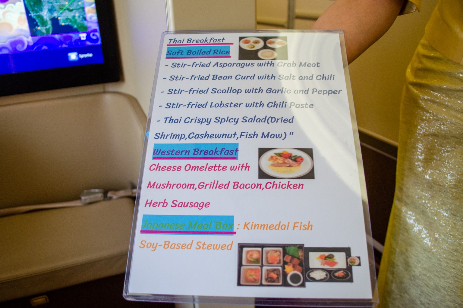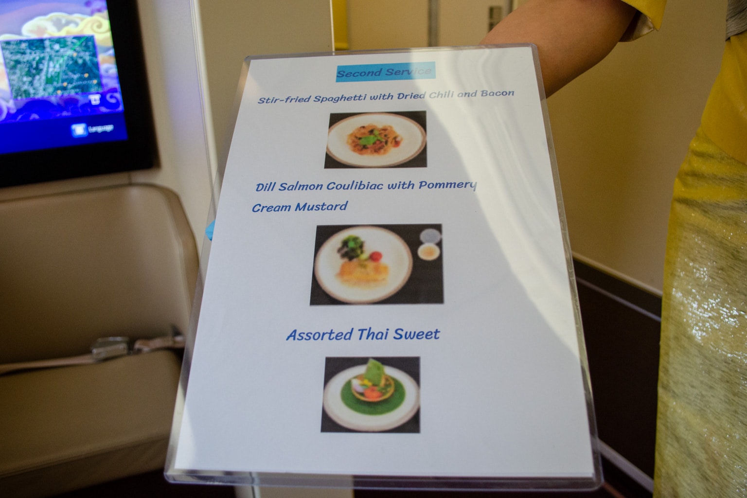 I’d chosen my meal in advance using the Thai Airways online meal pre-selection, but I was given yet another opportunity to peruse the menu in case I changed my mind.