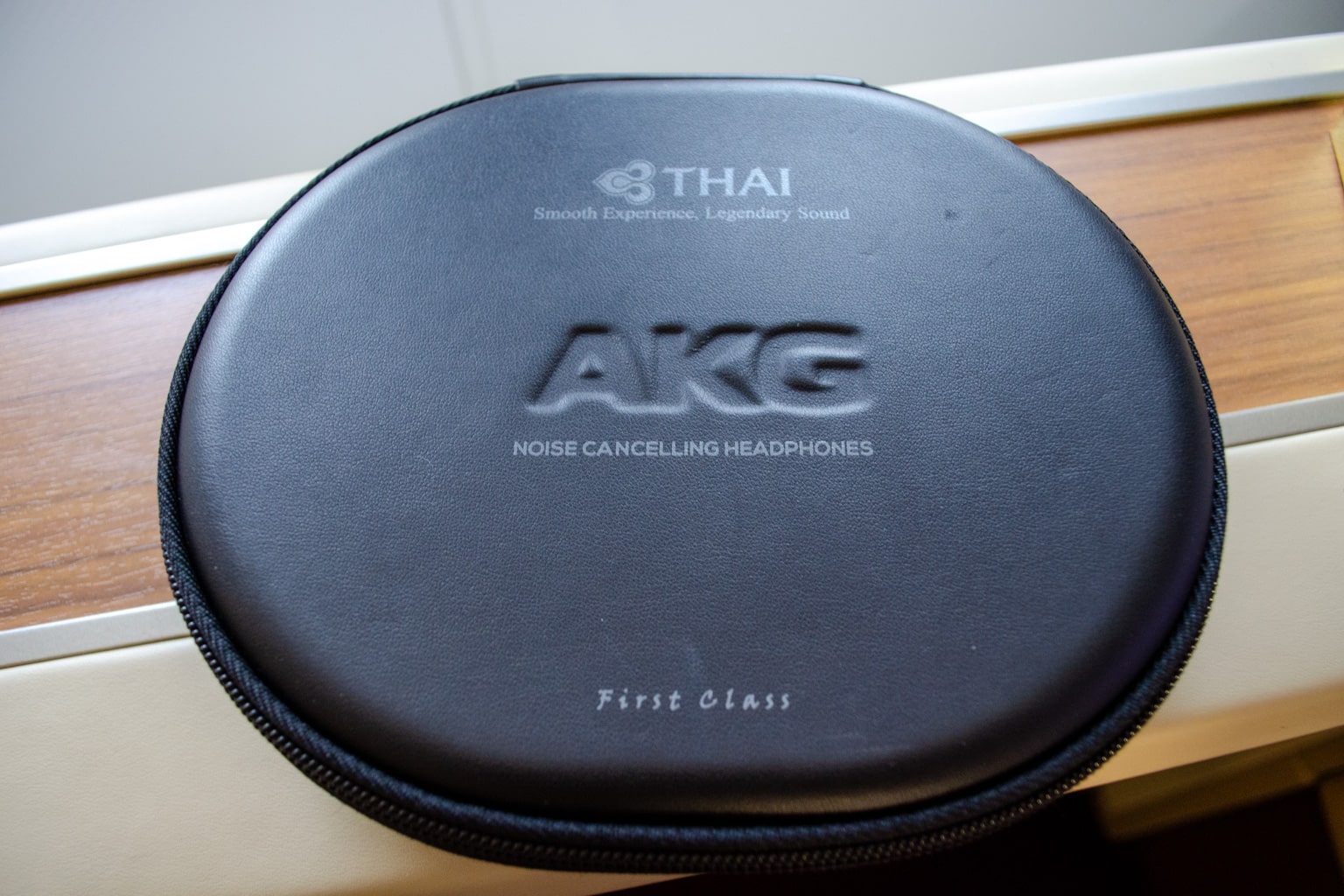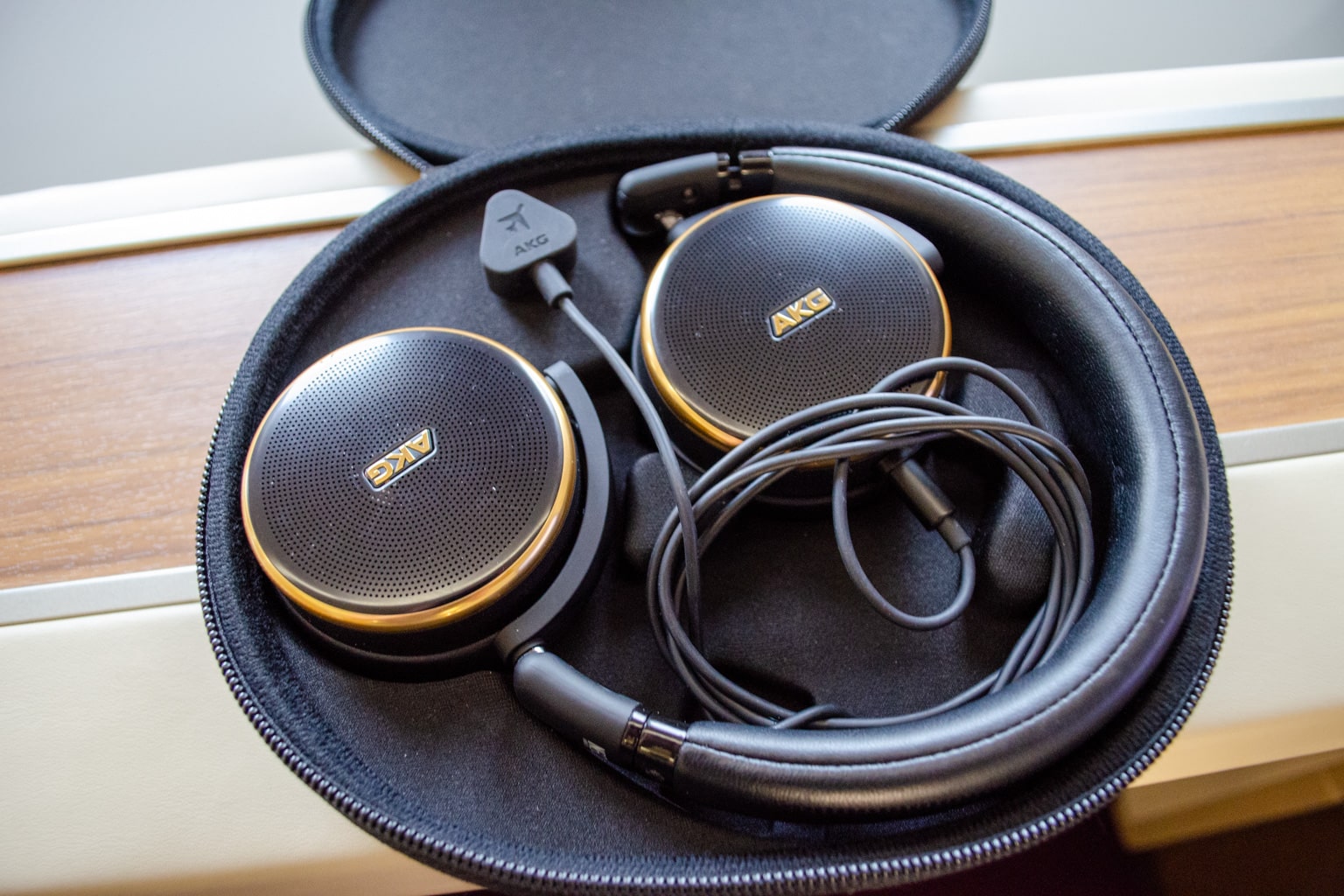 Along with my amenity kit, there were noise-cancelling headphones by AKG.