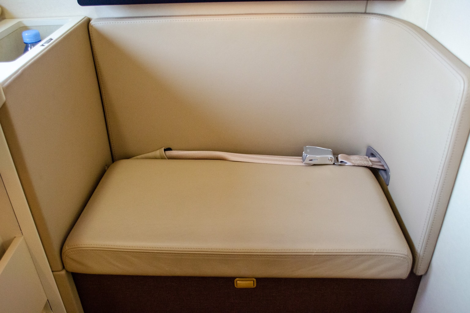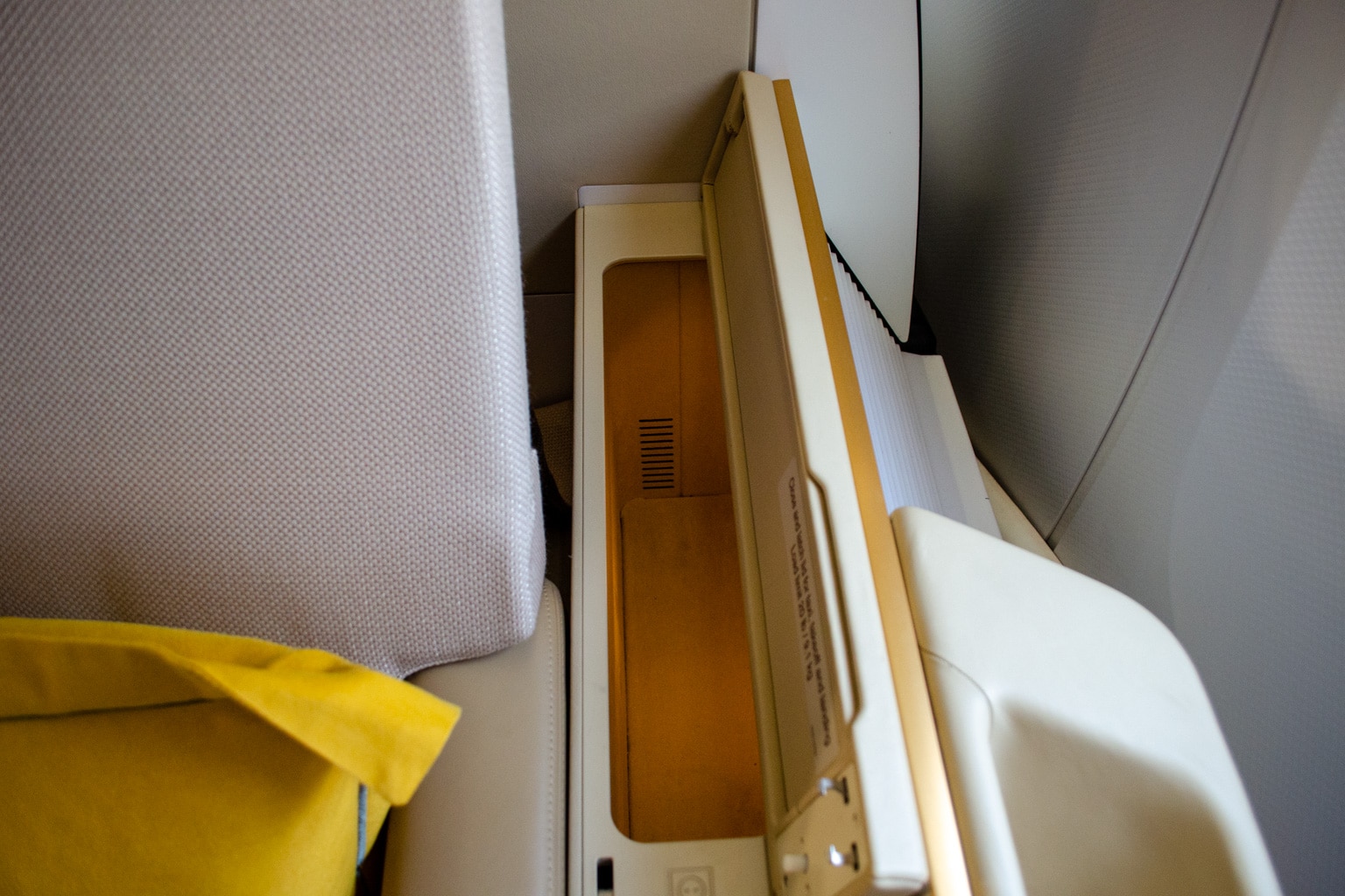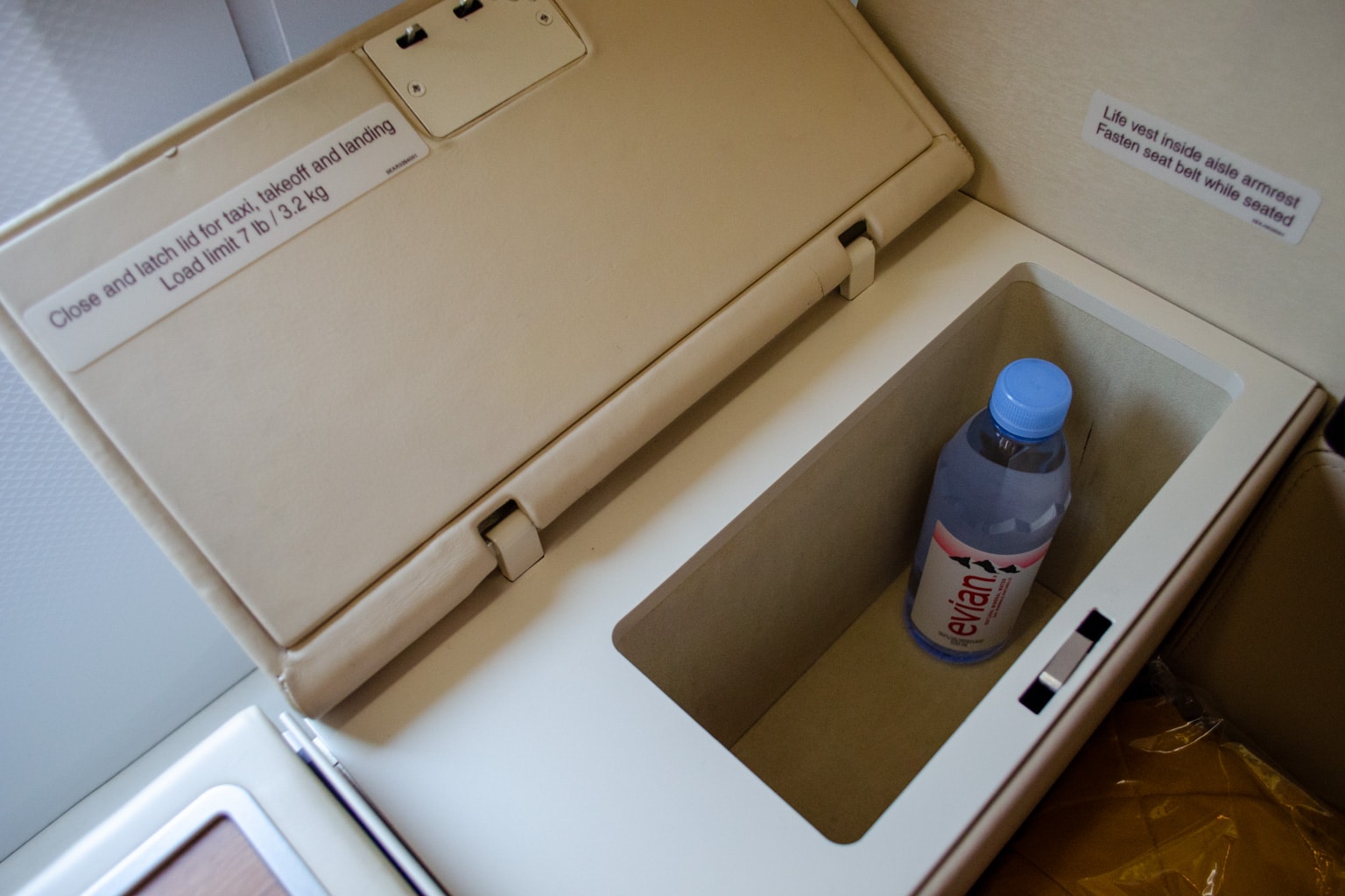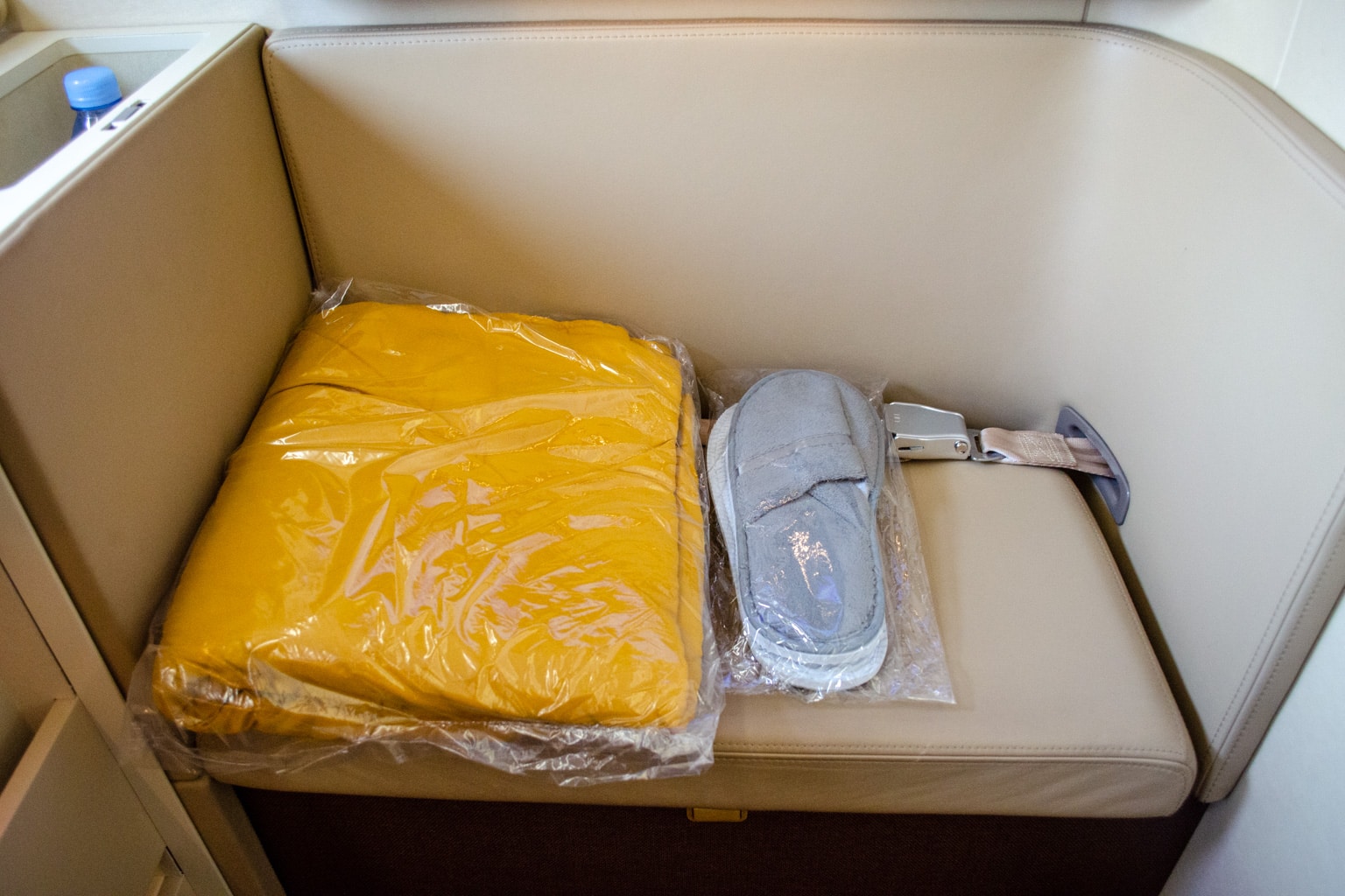 At the far left side of the suite, right next to the entertainment screen, there’s a small cubby where you can store a few items. I found a bottle of Evian water and noise-cancelling headphones waiting for me when I boarded.