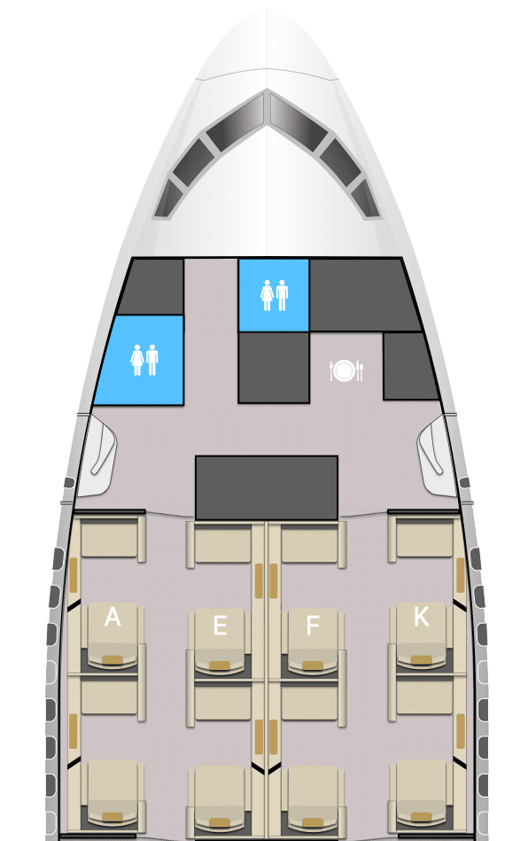 There are eight suites configured in a 1-2-1 layout, which take up rows 1 and 2 at the front of the plane.