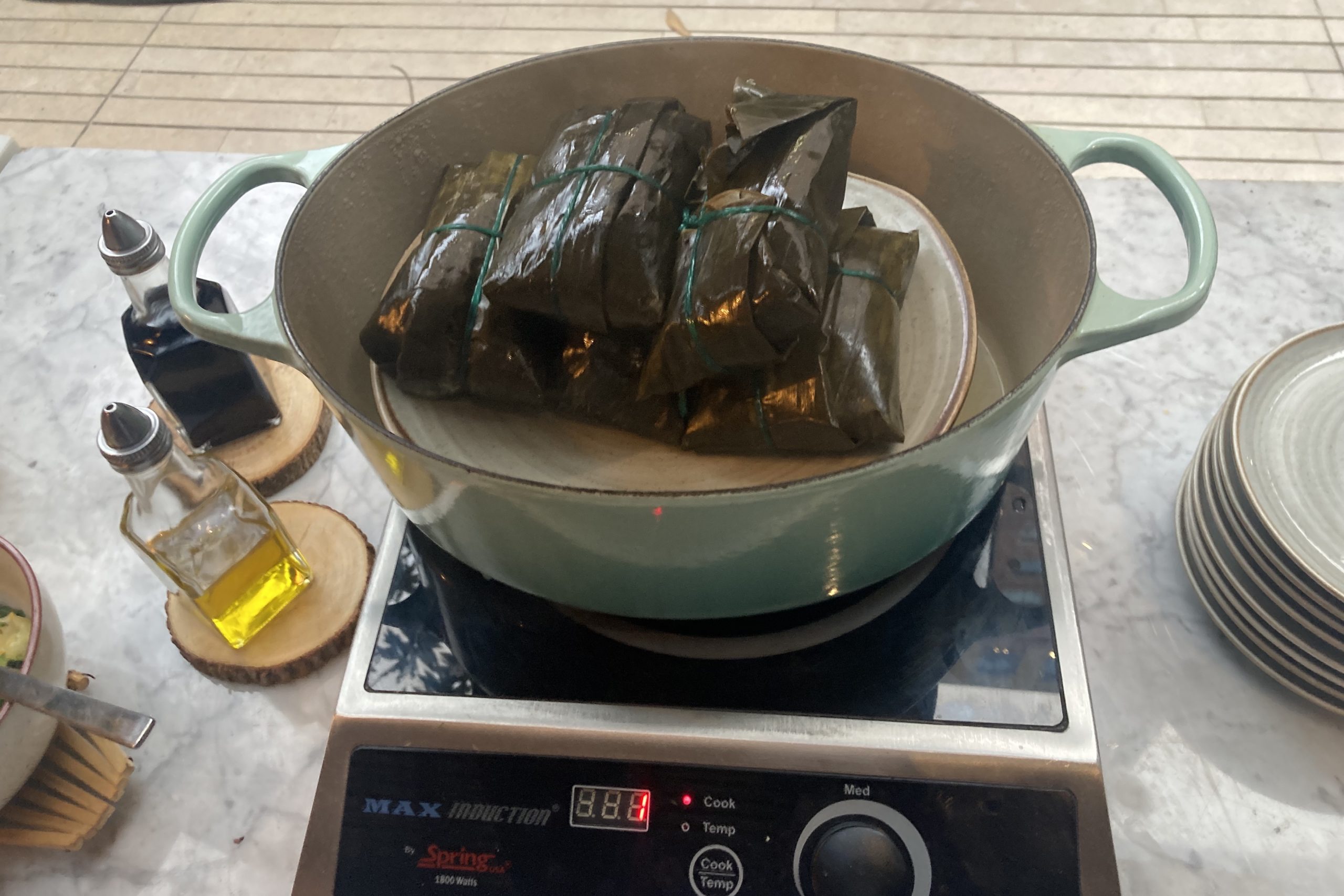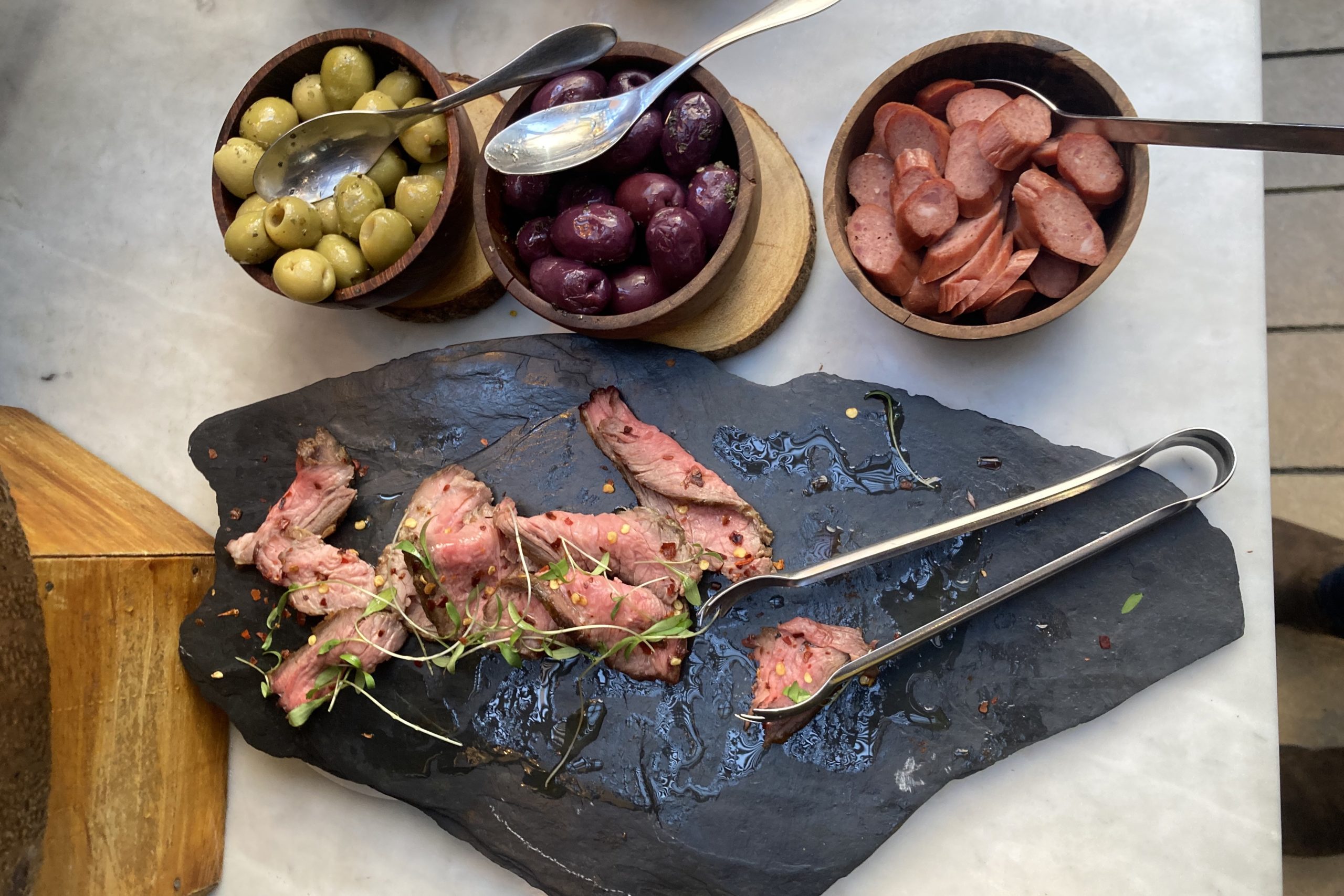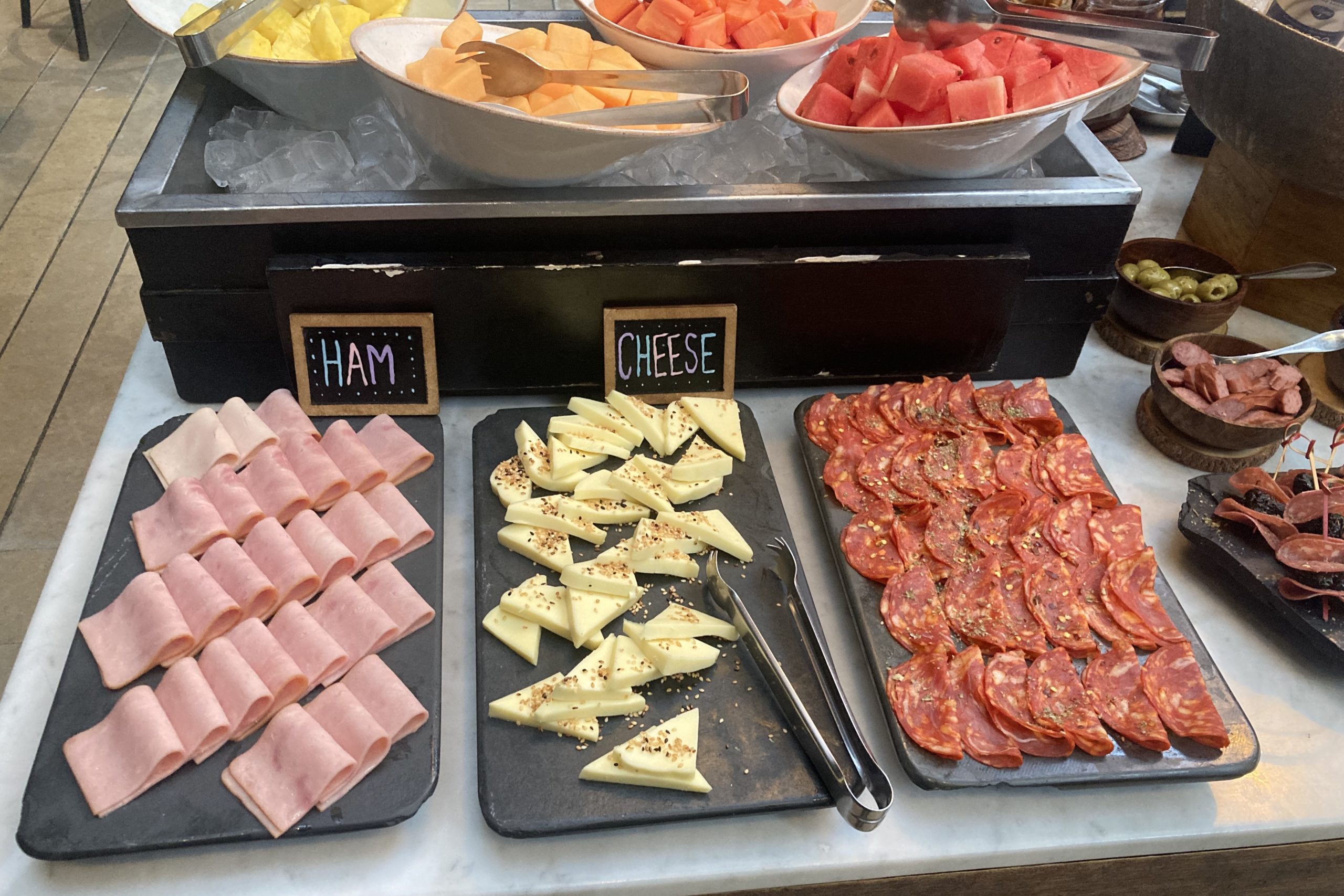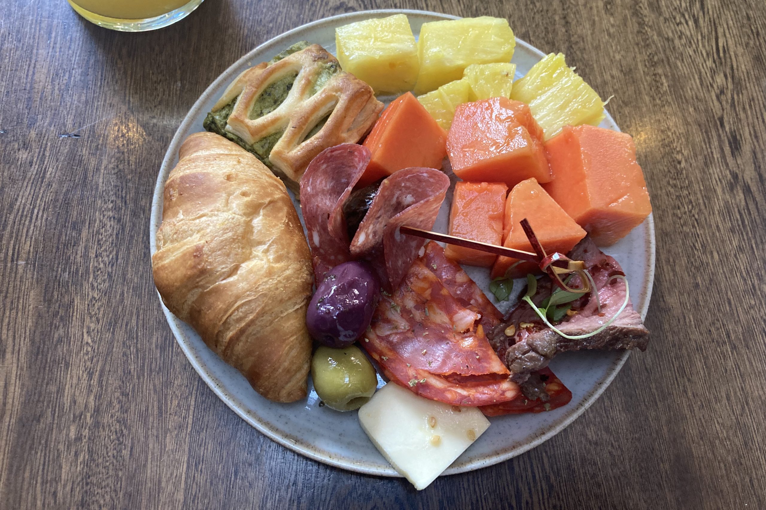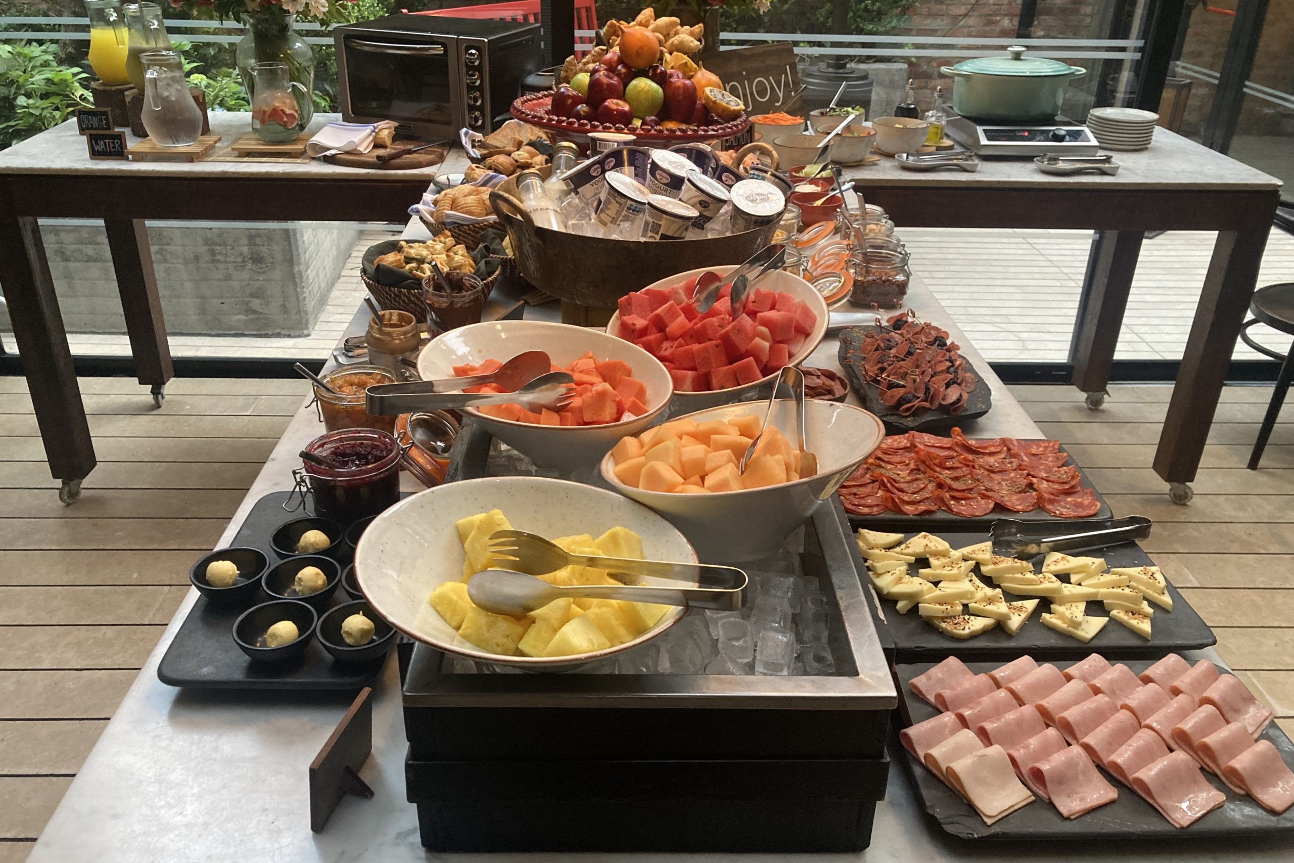 There’s a self-serve buffet available with a wide range of fresh fruit, breads, meats and cheeses, juices, and tamales.