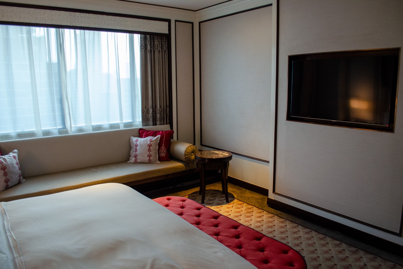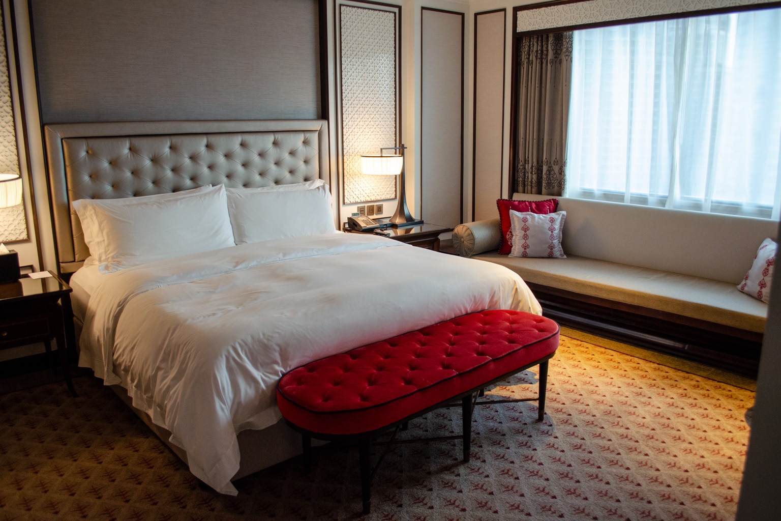 The living room leads into the bedroom, which has a long bench set against the window and a king bed as the focal point. At the foot of the bed is a plush red bench, which added a nice pop of colour to the room.