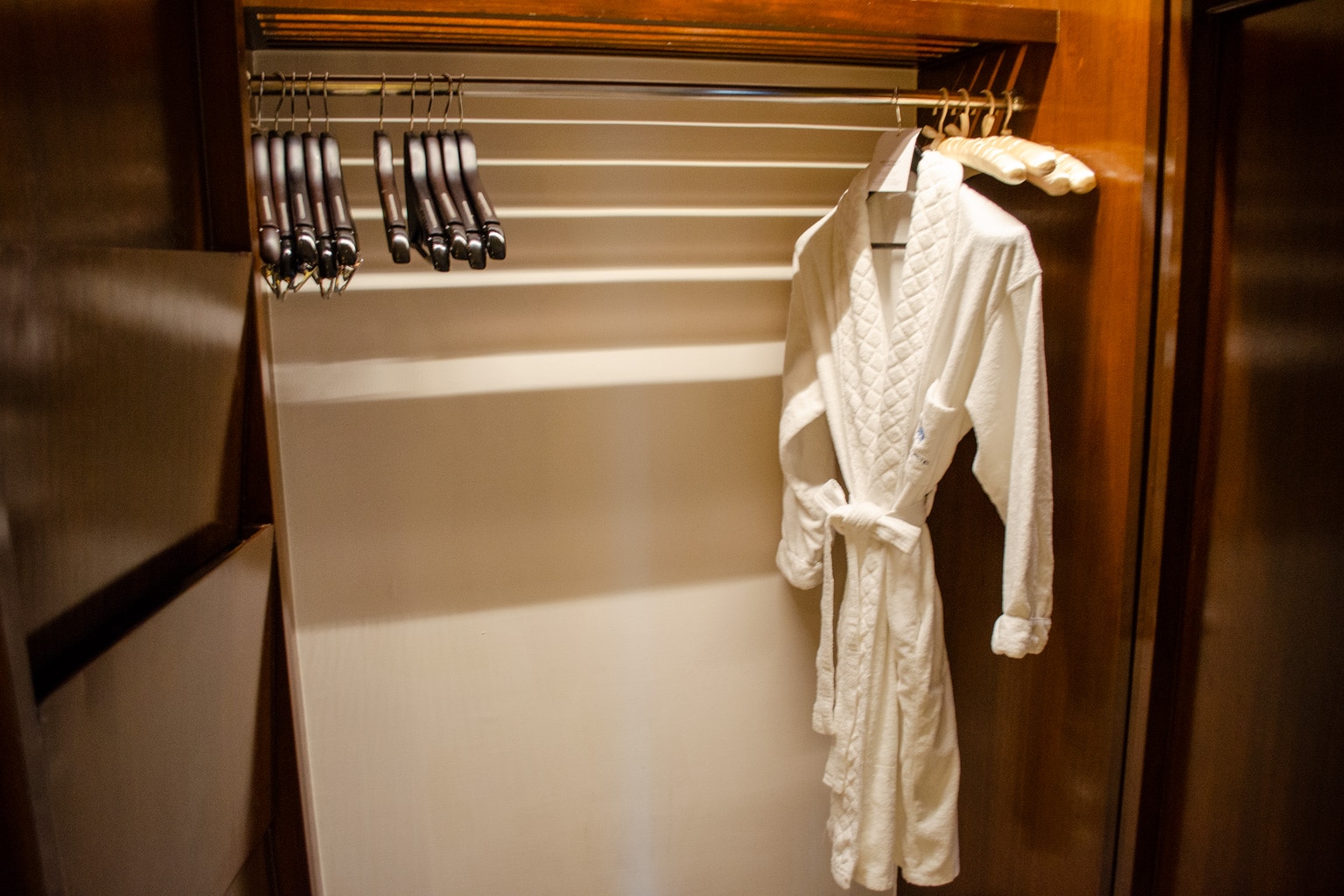 To the side of the bedroom is a small hallway that’s home to the room’s closet and a luggage rack. We also found extra bathrobes set in the closet.