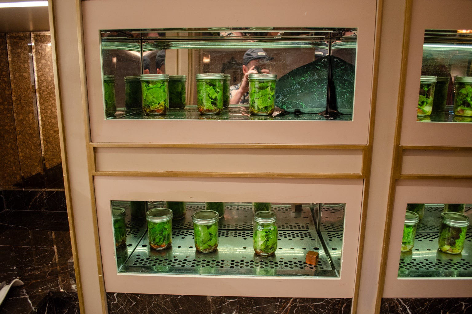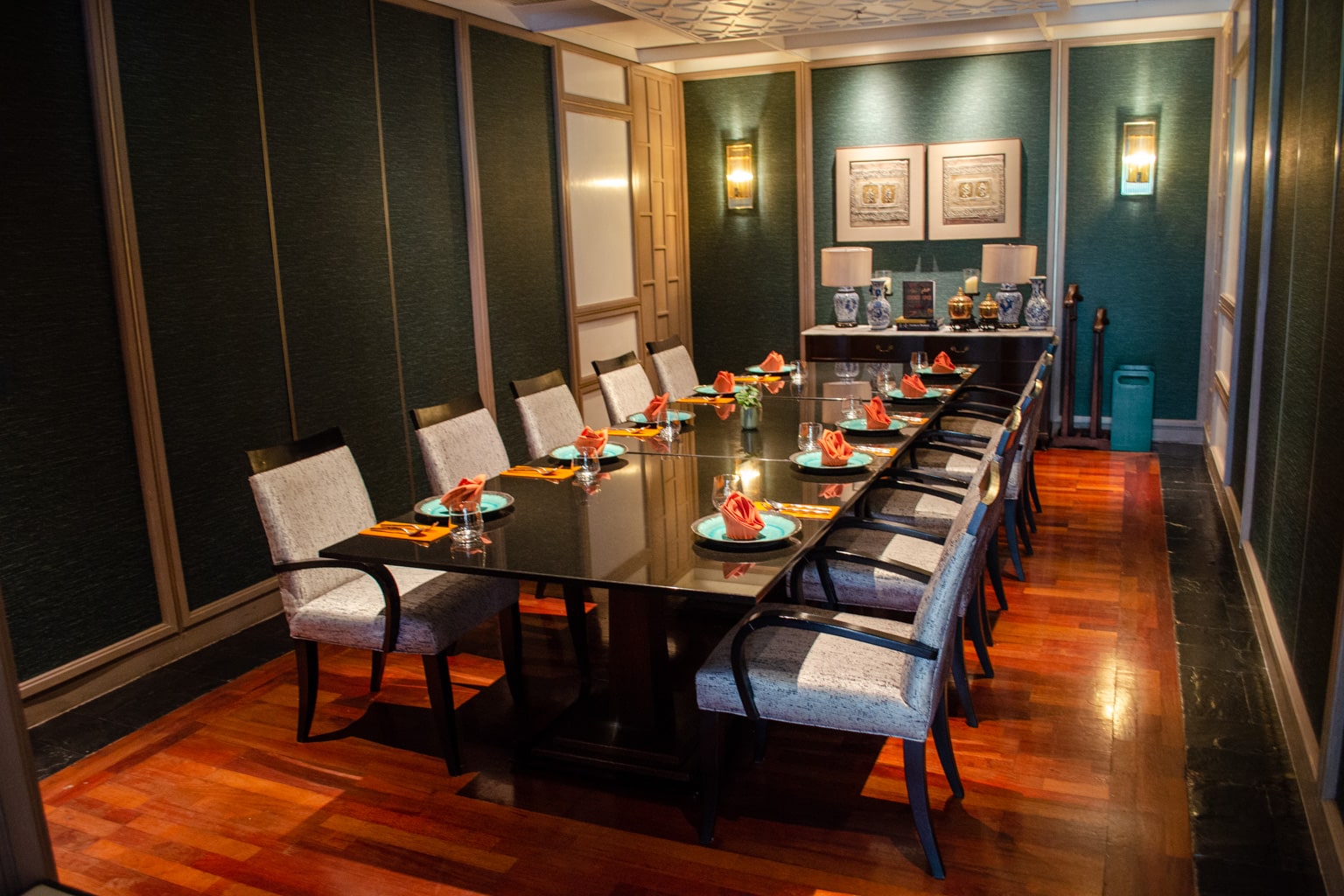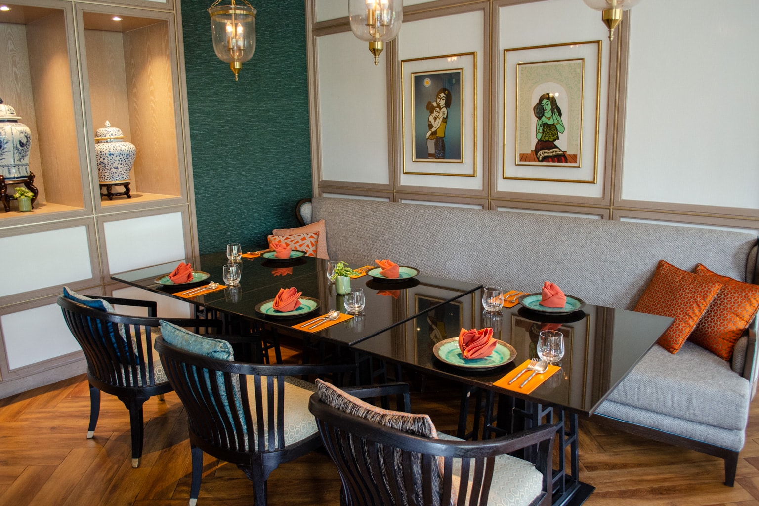 The interior design is a throwback to the 1920s in China with a heavy Art Deco style. The seating options range from large circular booths to more intimate four person dining arrangements.