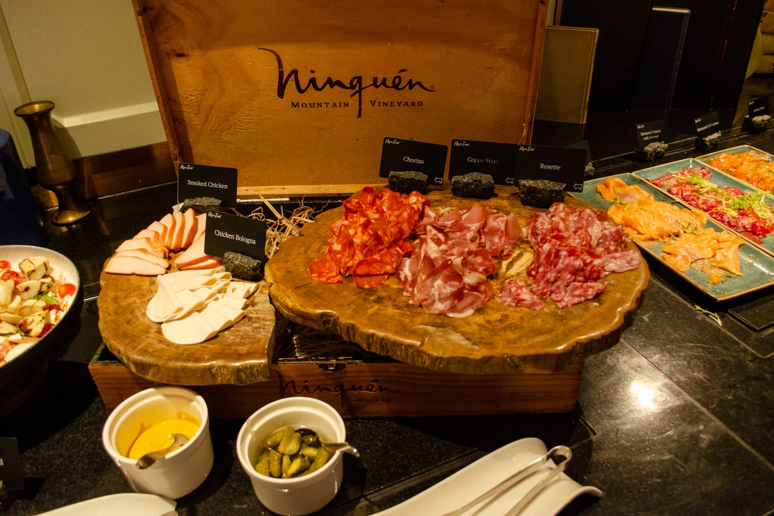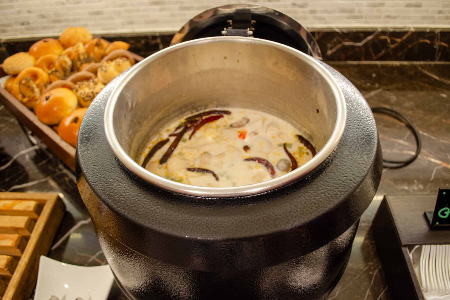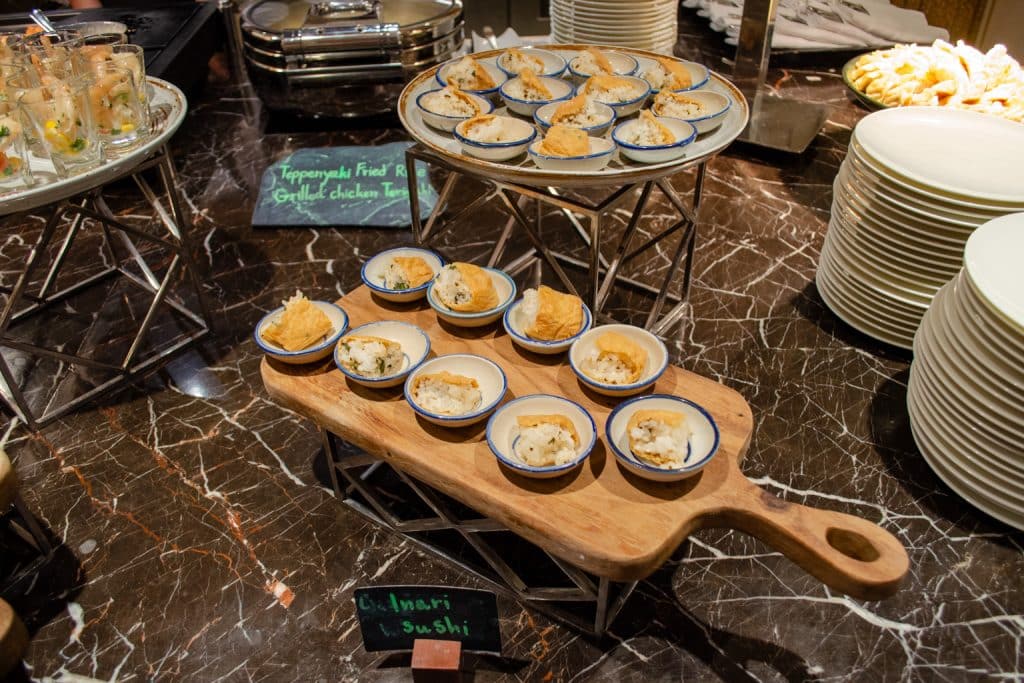 We popped in for a quick snack and a drink on the evening of our stay. The lounge had a fairly impressive buffet, which included sushi, gyoza, tom kha gai soup, charcuterie, pastries, and light snacks.