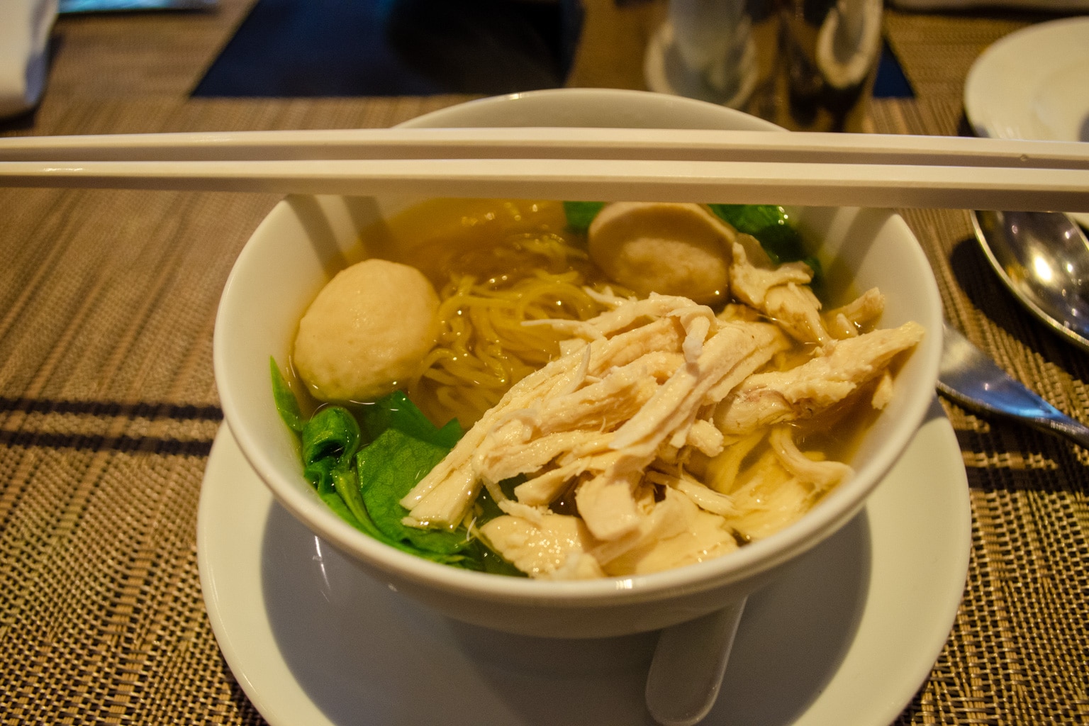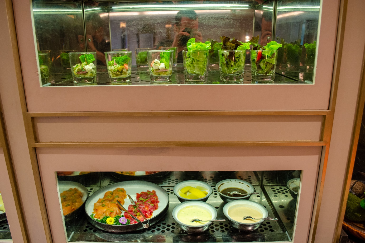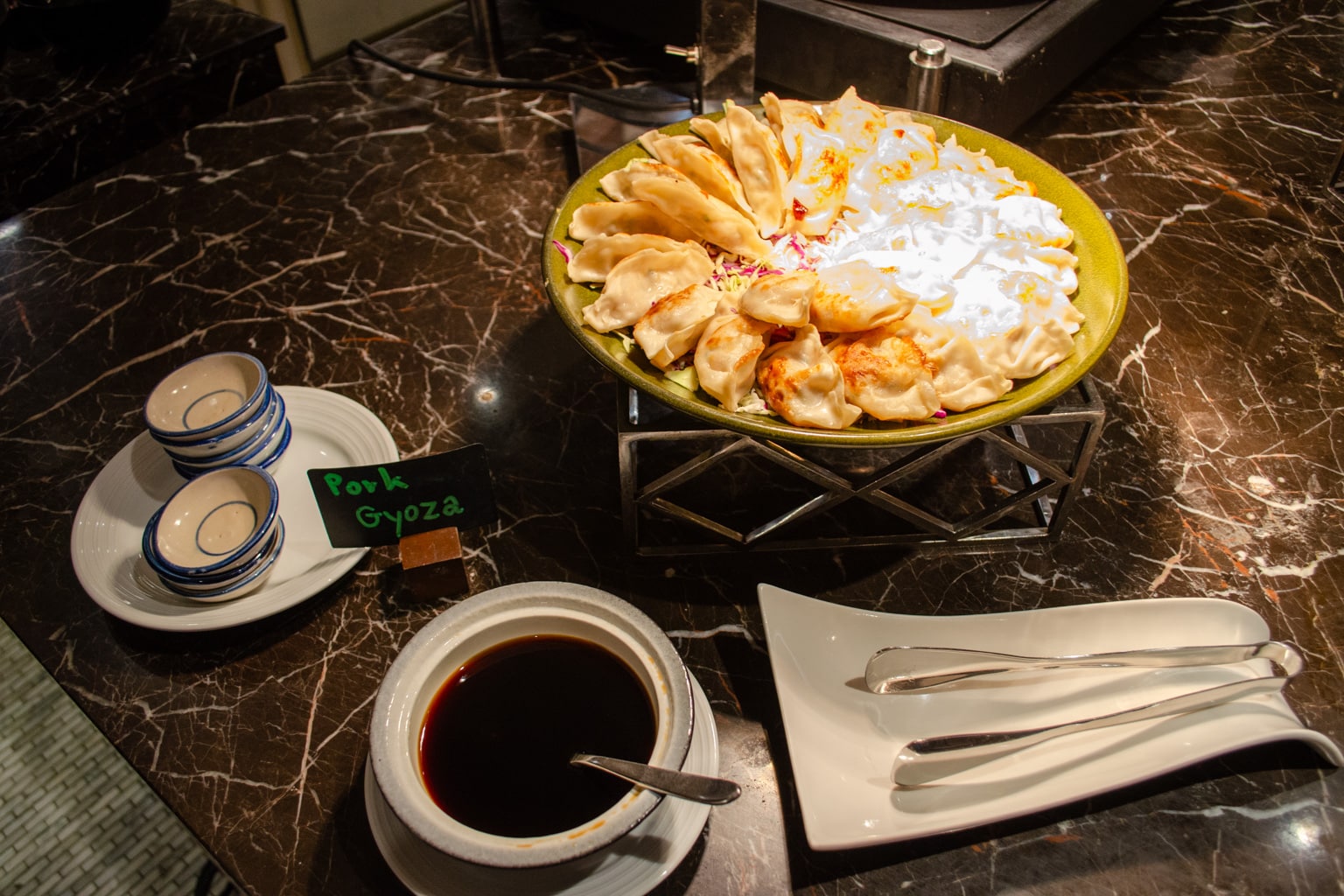 We popped in for a quick snack and a drink on the evening of our stay. The lounge had a fairly impressive buffet, which included sushi, gyoza, tom kha gai soup, charcuterie, pastries, and light snacks.