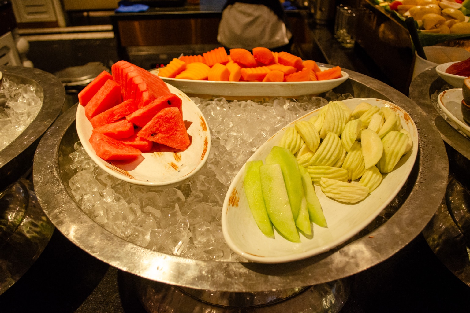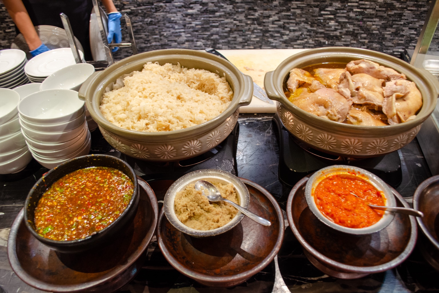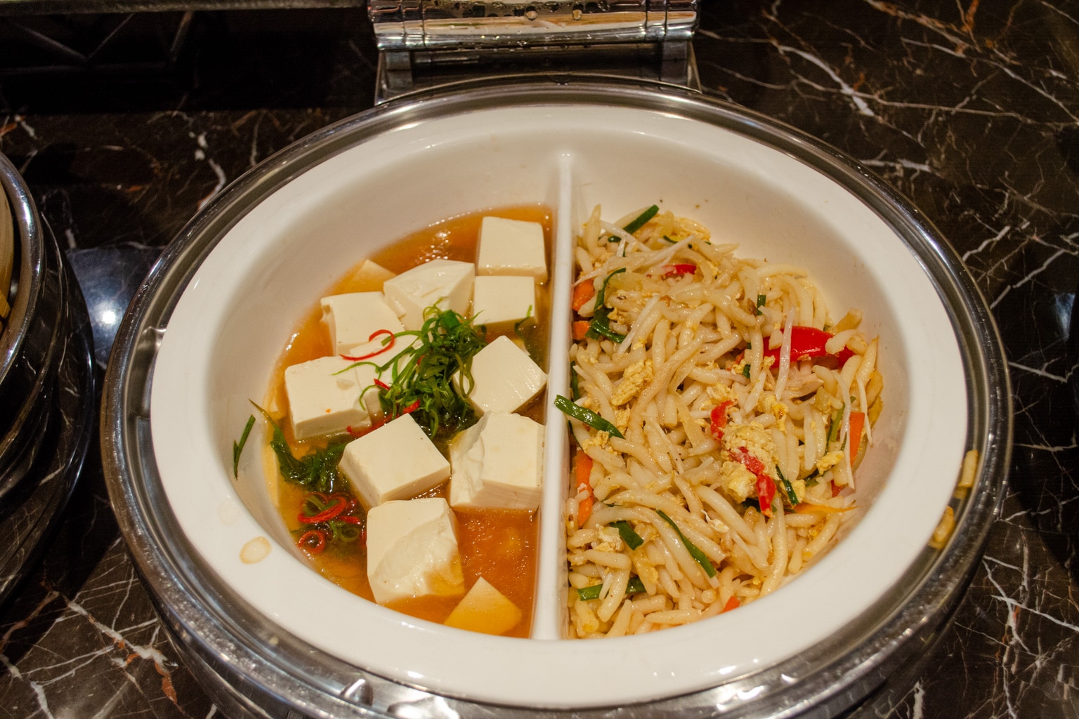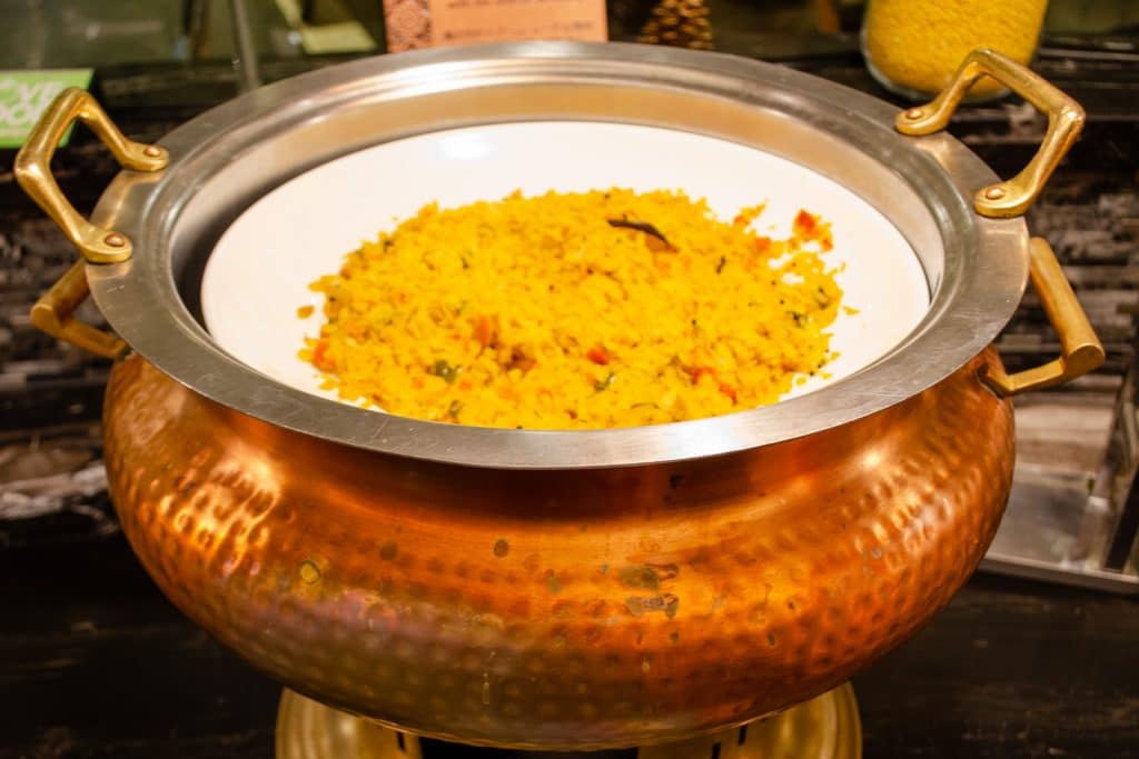 There are lots of different hot buffet items available, including fried rice, red bean congee, silken tofu, beans, bacon, dim sum, and even Hainanese chicken rice, to name a few. You’ll also find dishes from a number of world cuisines, including Indian, Thai, Western, Chinese, and Middle Eastern.