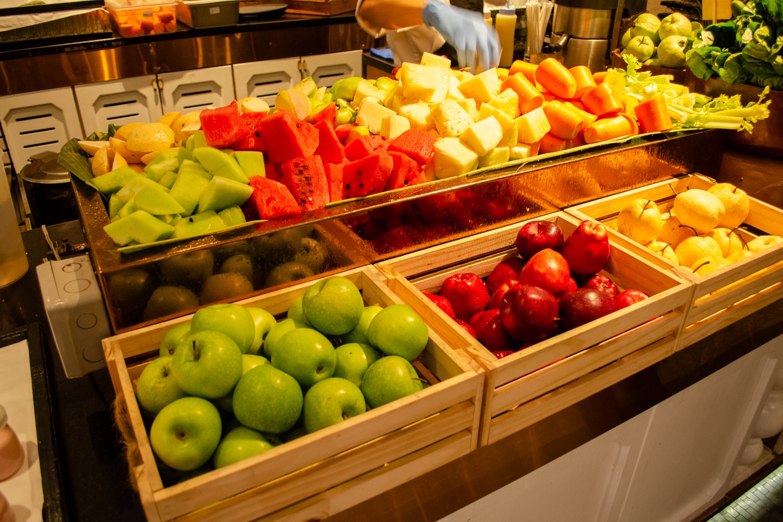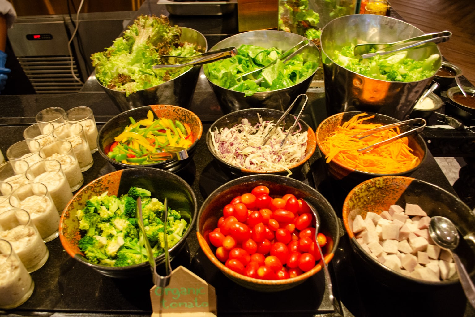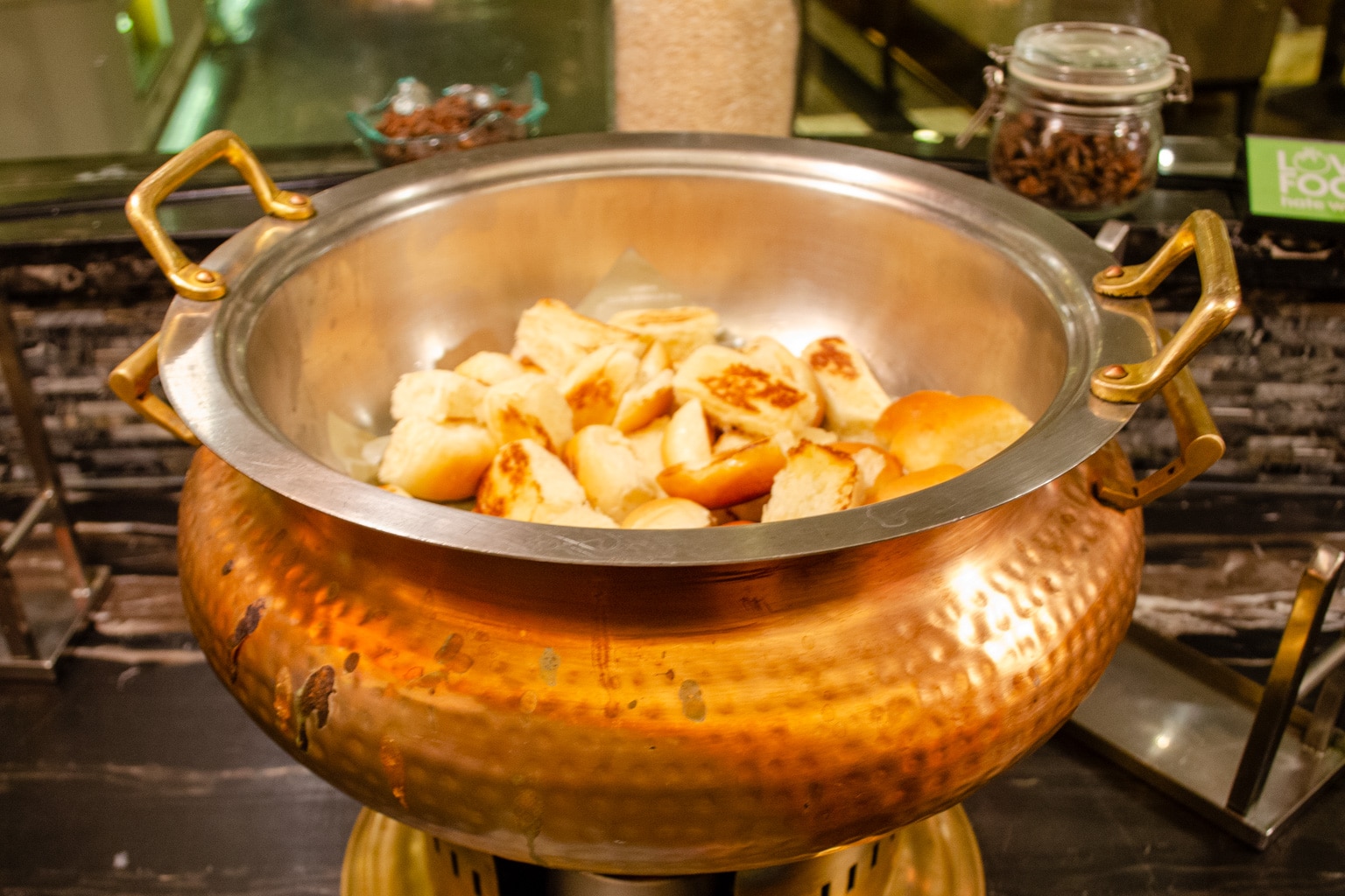 There are lots of different hot buffet items available, including fried rice, red bean congee, silken tofu, beans, bacon, dim sum, and even Hainanese chicken rice, to name a few. You’ll also find dishes from a number of world cuisines, including Indian, Thai, Western, Chinese, and Middle Eastern.