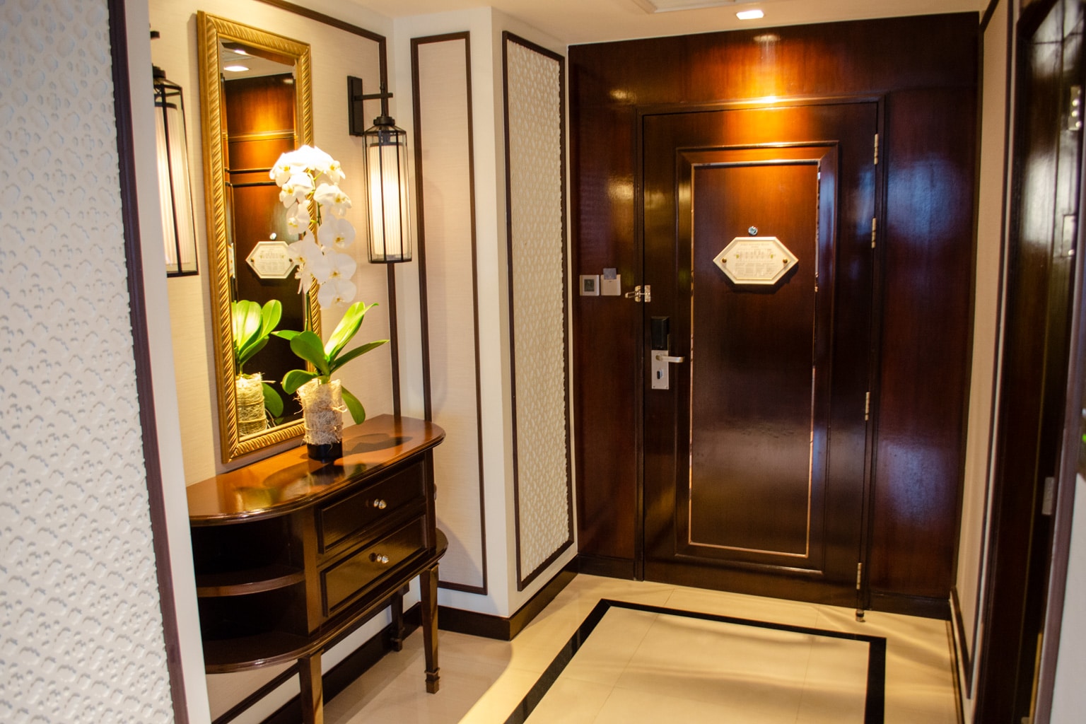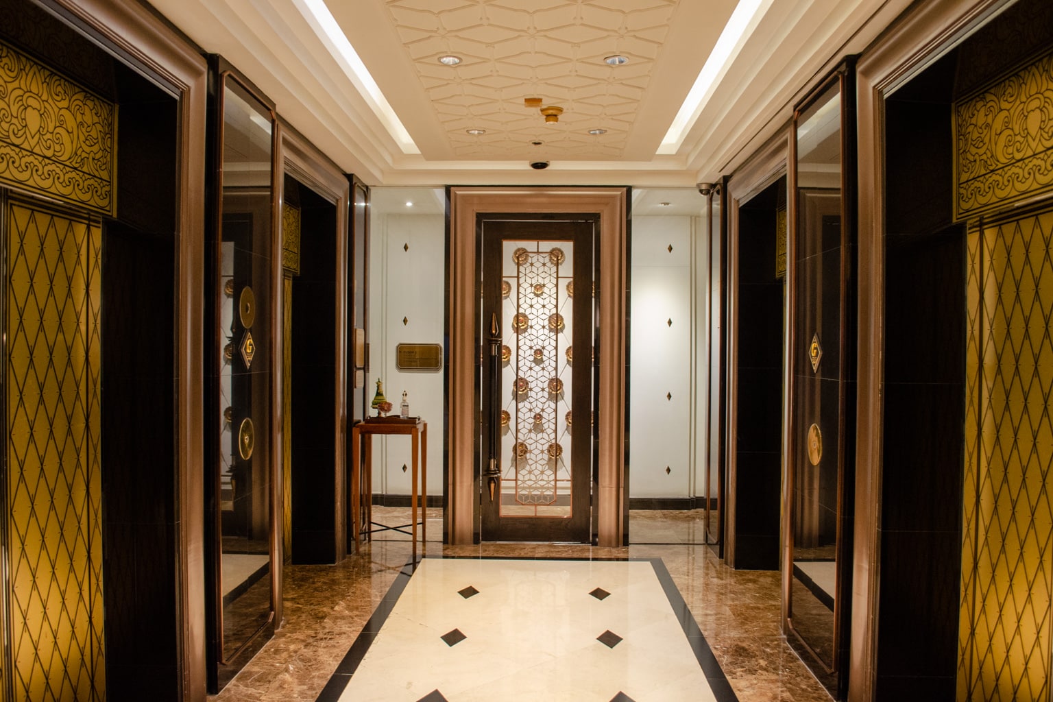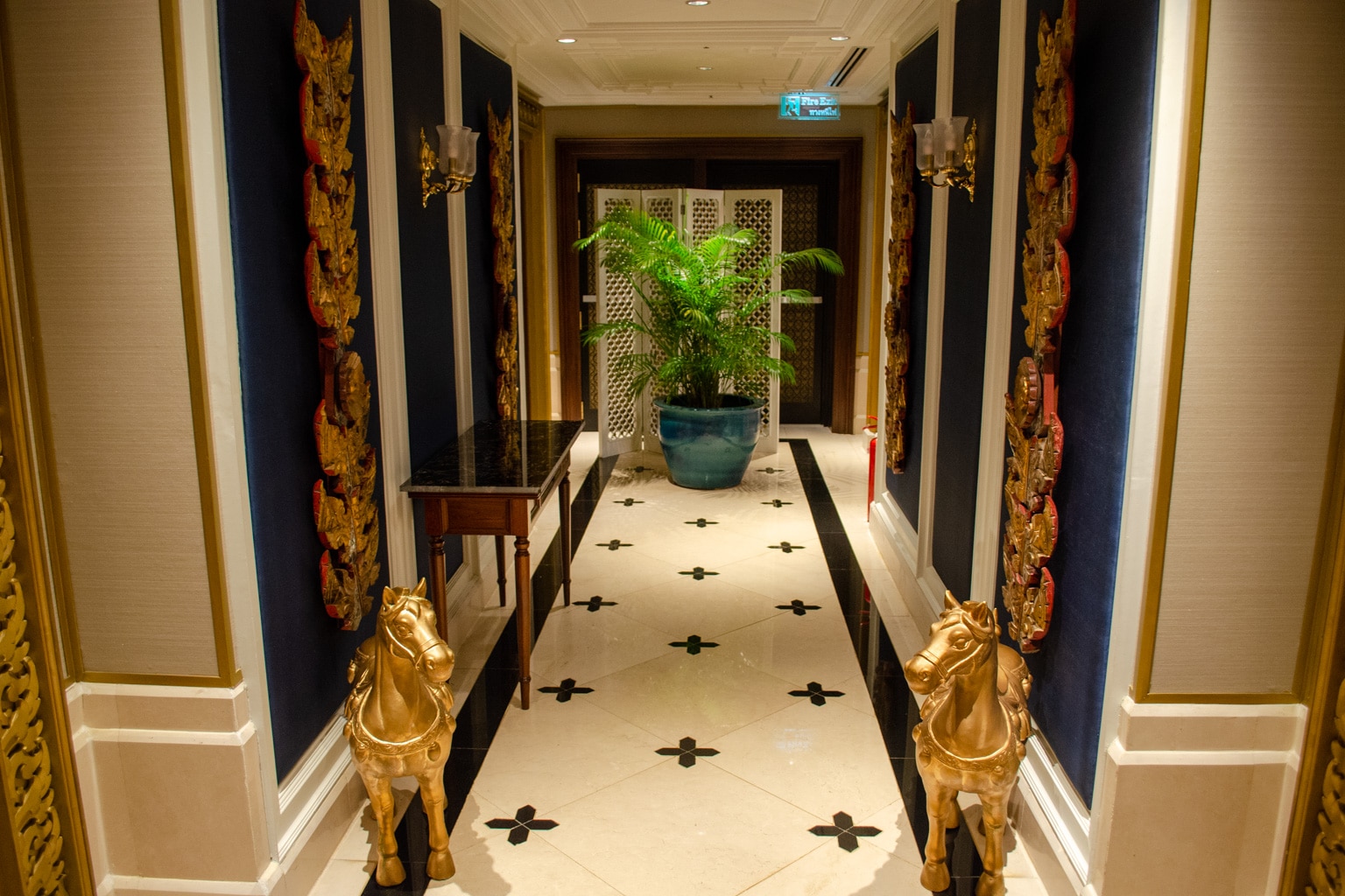 Immediately upon entering, you arrive in an elegant foyer with two golden horses, and white marble floors with blue and gold accent walls on each side.