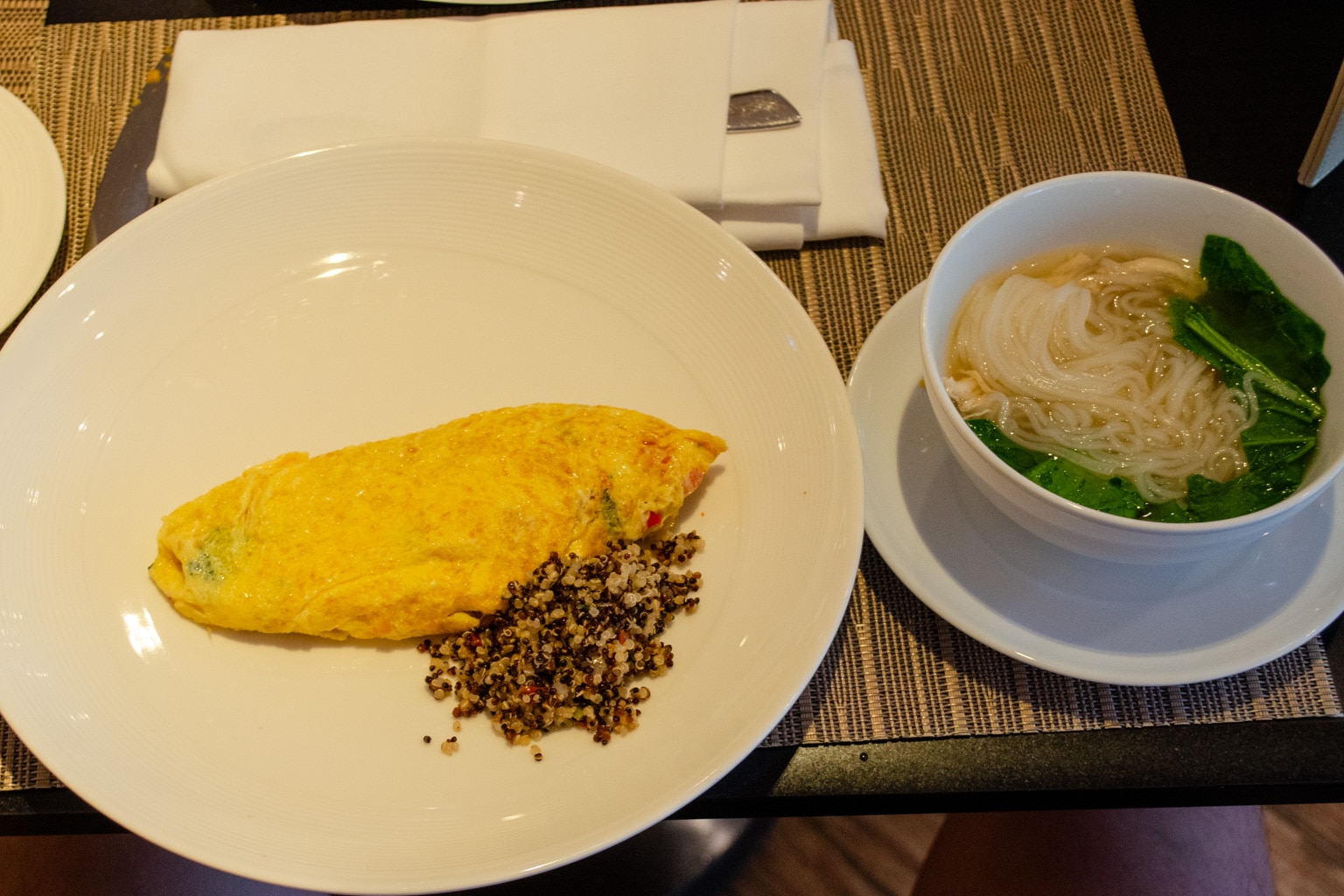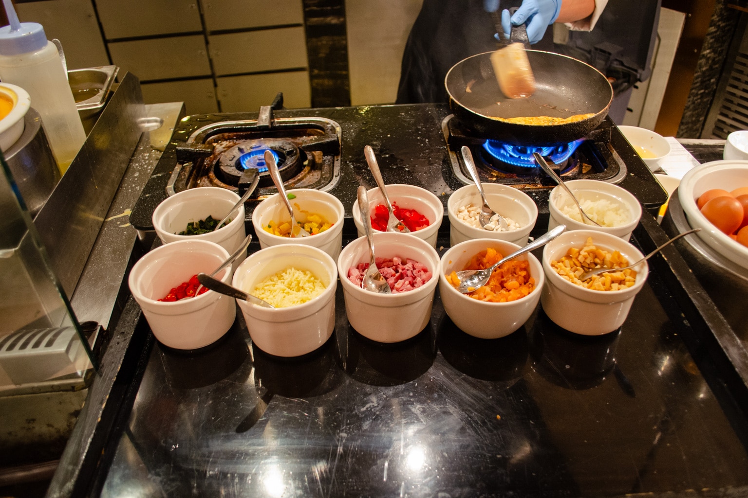 Along with self-serve buffet options, there are two live cooking stations, where you can customize both your omelets and noodle soup orders, and watch the chef prepare it right in front of you.