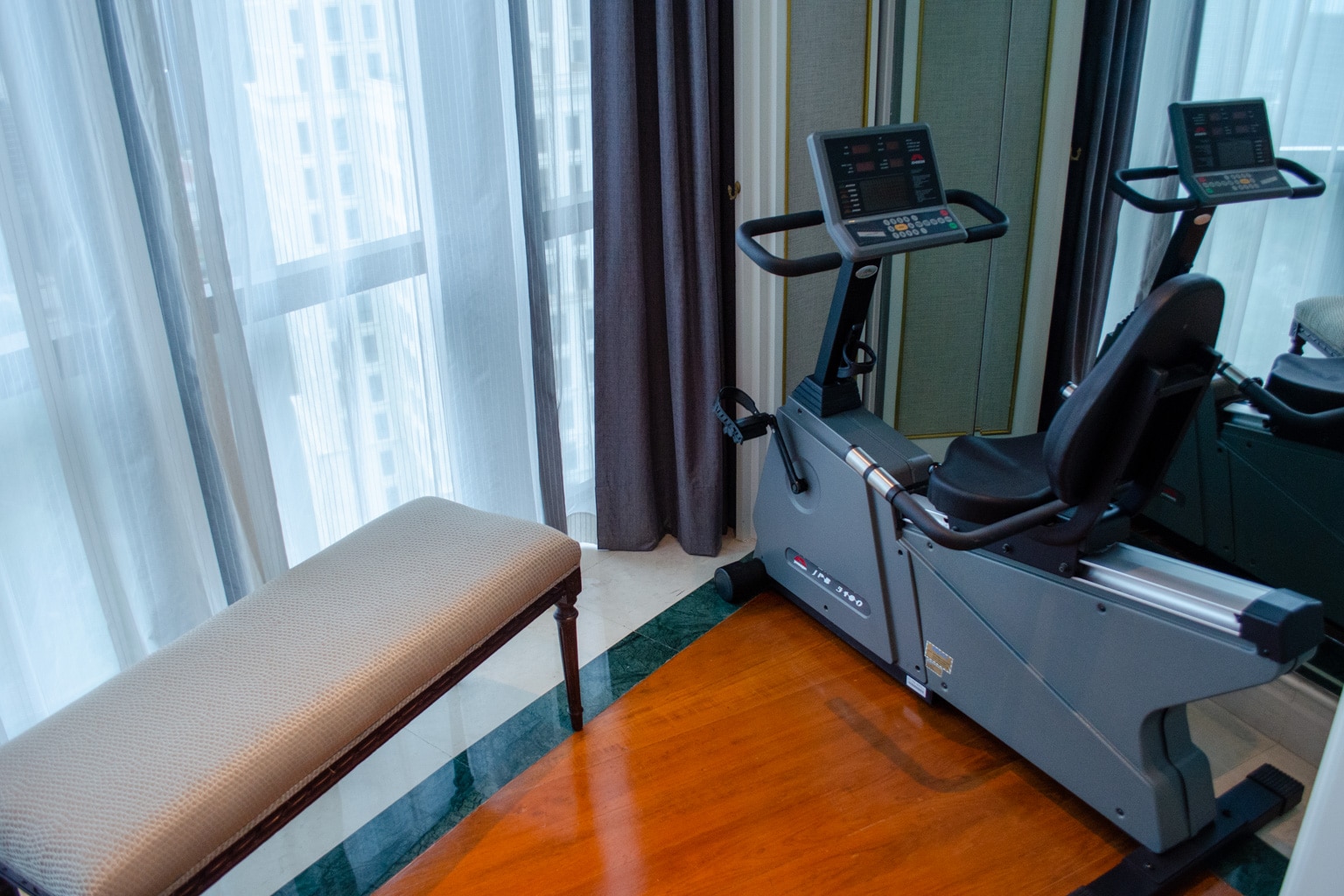 There is also an exercise bike tucked into the corner of the suite, which is a unique touch.