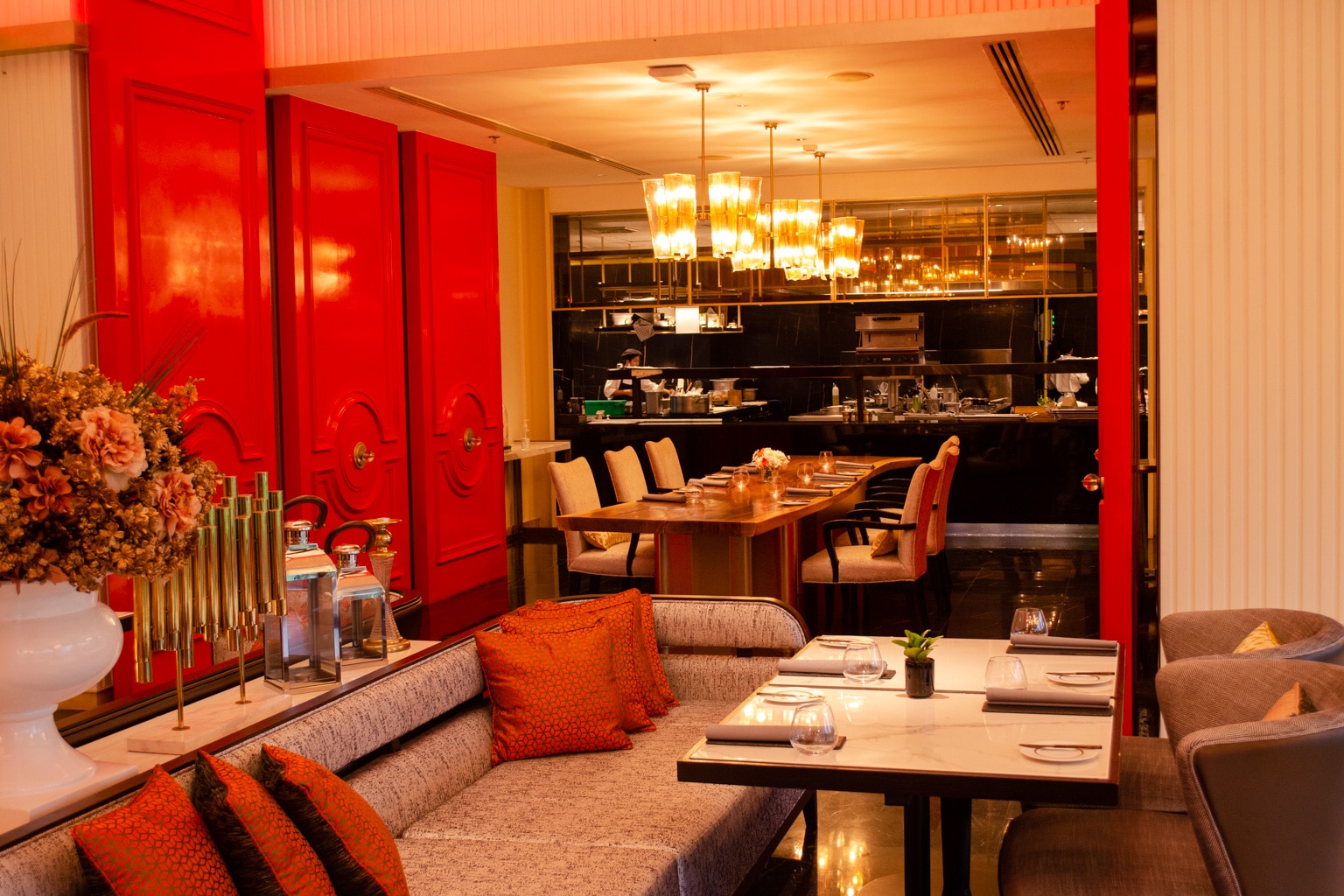 The interior is mainly outfitted with white colours, and is contrasted with bright, bold reds, which gives the entire restaurant a dramatic yet airy feel.