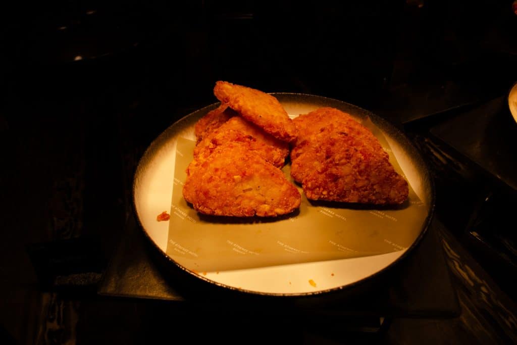 During evening hors d’oeuvres, I enjoyed a nice French 75 cocktail paired with fried rice and roasted chicken.