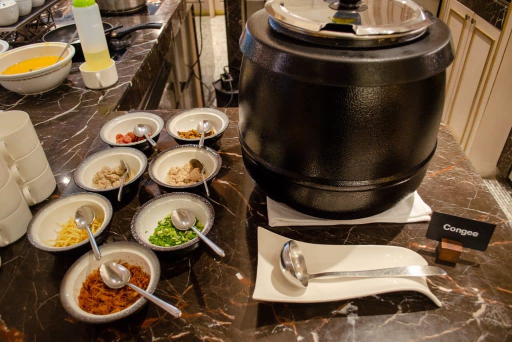 Here, you can find a nice selection of breakfast items, including congee, bacon, hash browns, sausages, tofu, Thai green curry, dumplings, fresh fruit, and a salad bar.