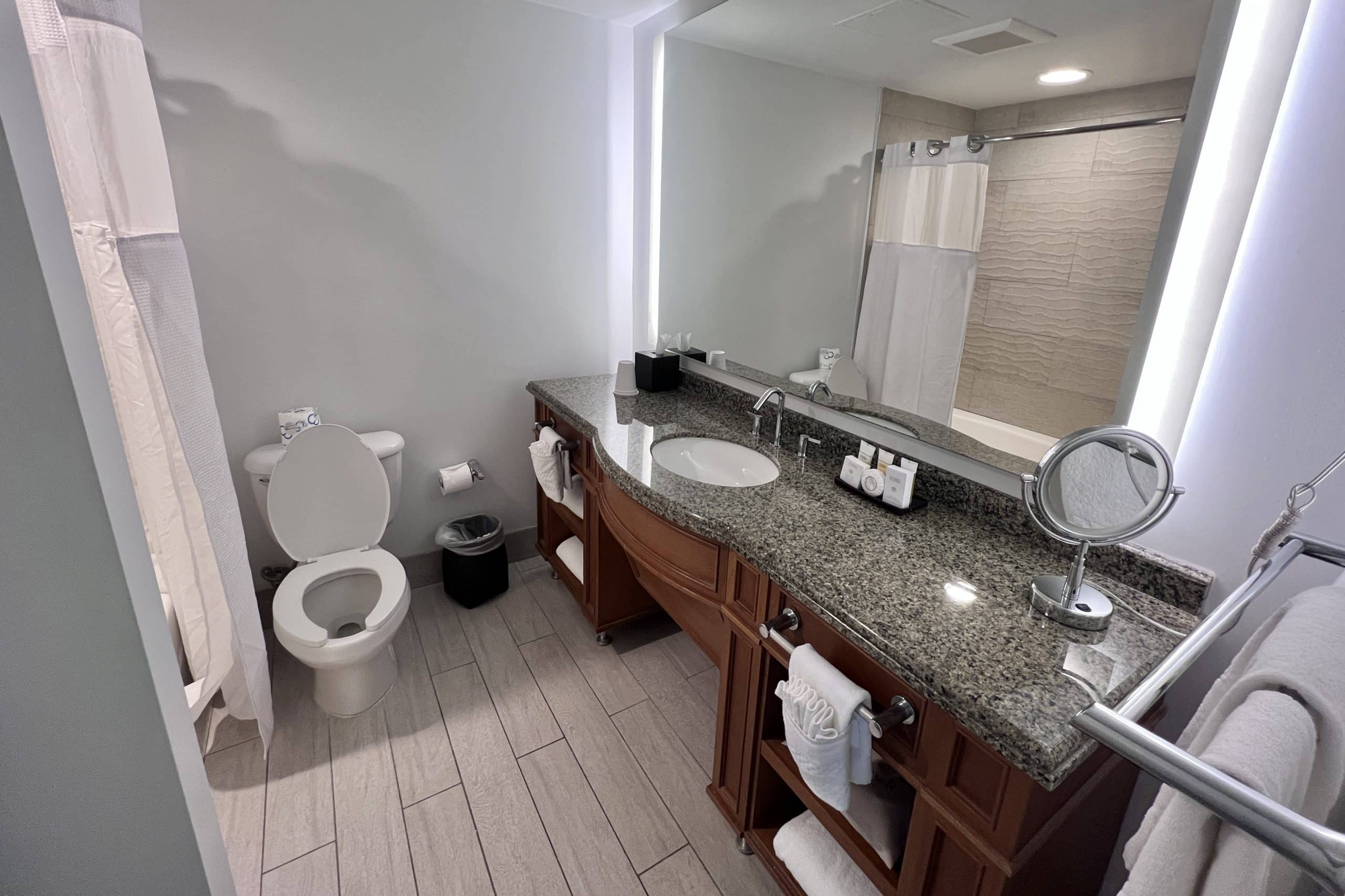 Across from here was the bathroom, which featured a toilet, a bathtub, and a large vanity with a single sink.