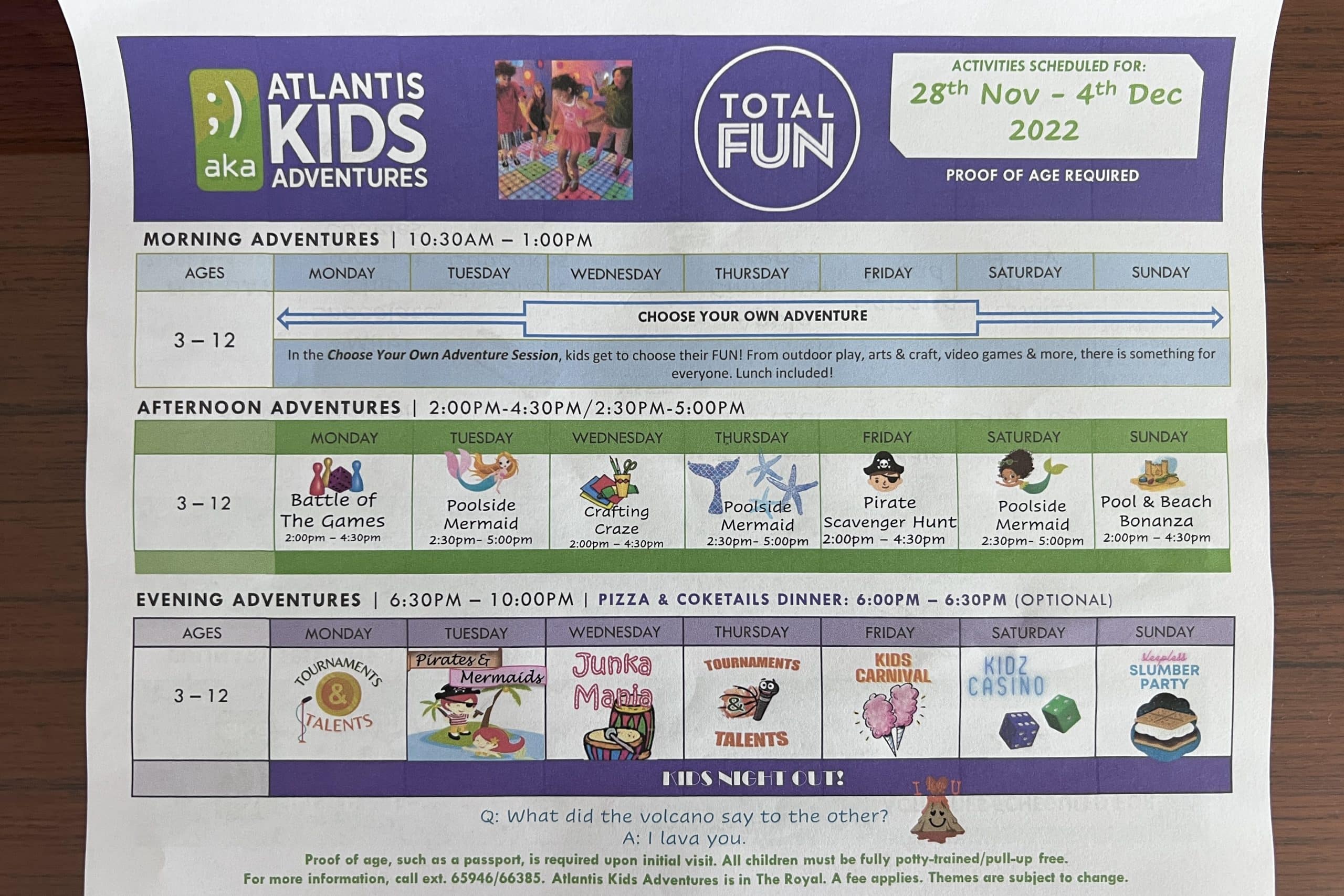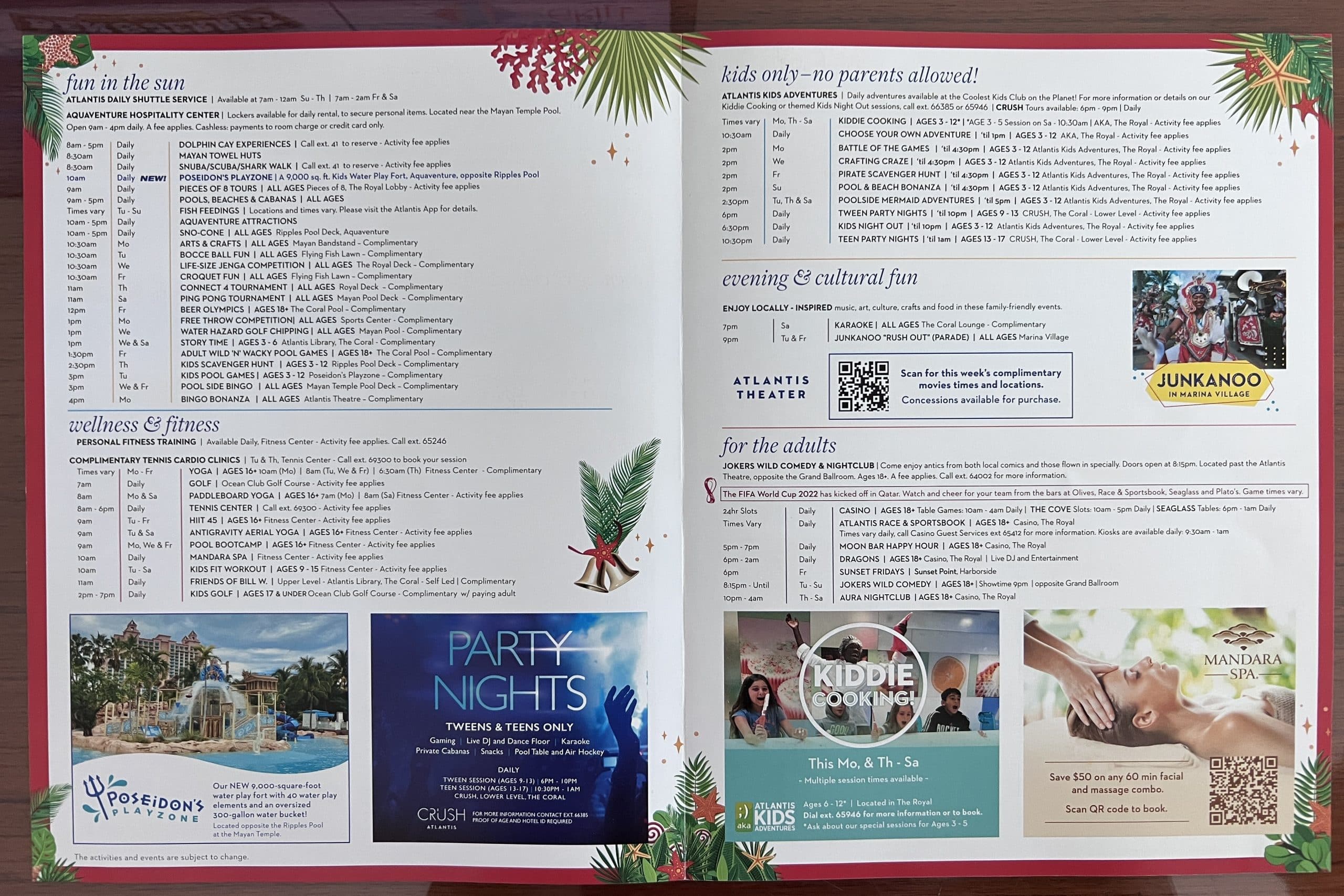 The Coral also features a weekly activity guide which features both paid and complimentary activities. Some complimentary activities include bingo, poolside games, and scavenger hunts.