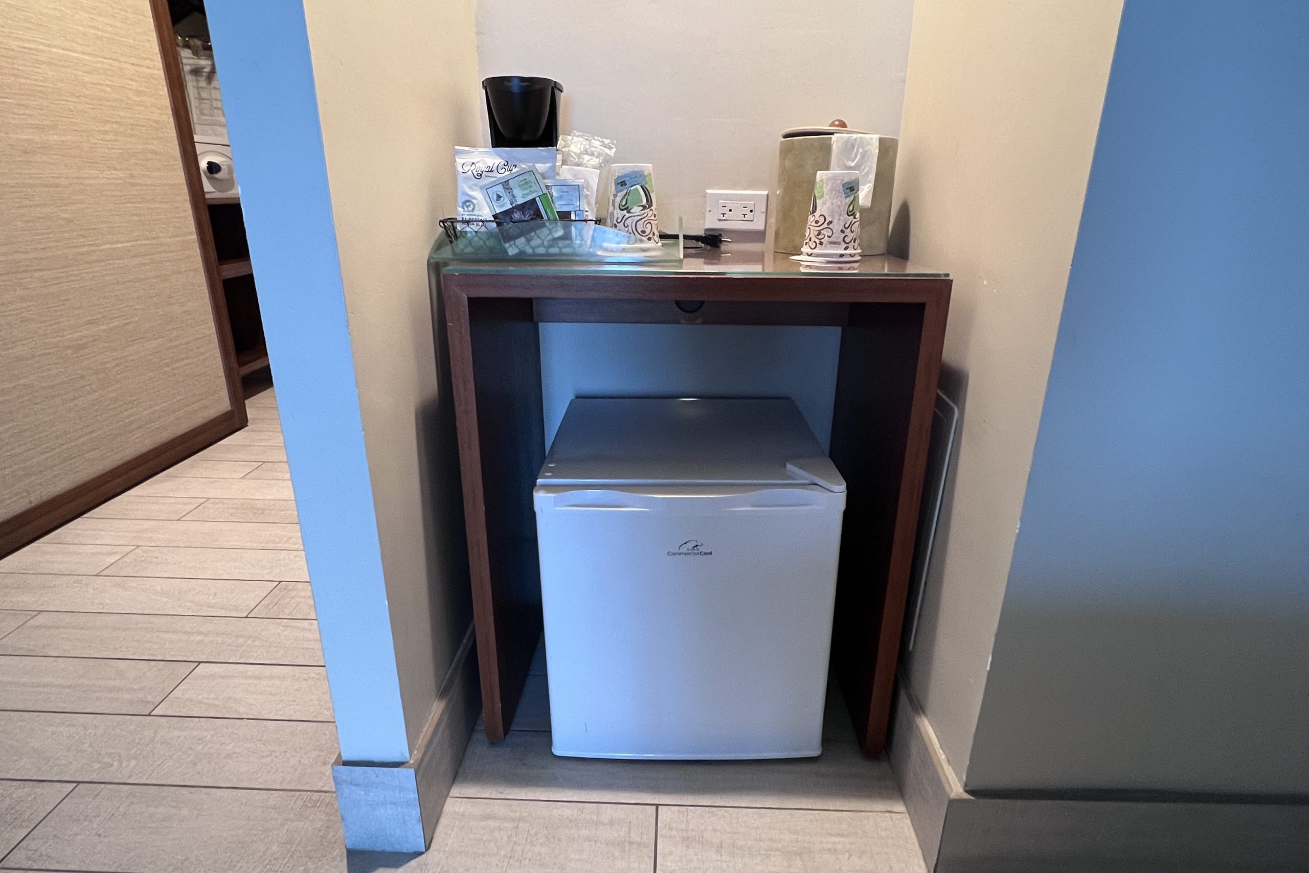 There was a tiny coffee and tea station close to an empty mini-fridge, as well.