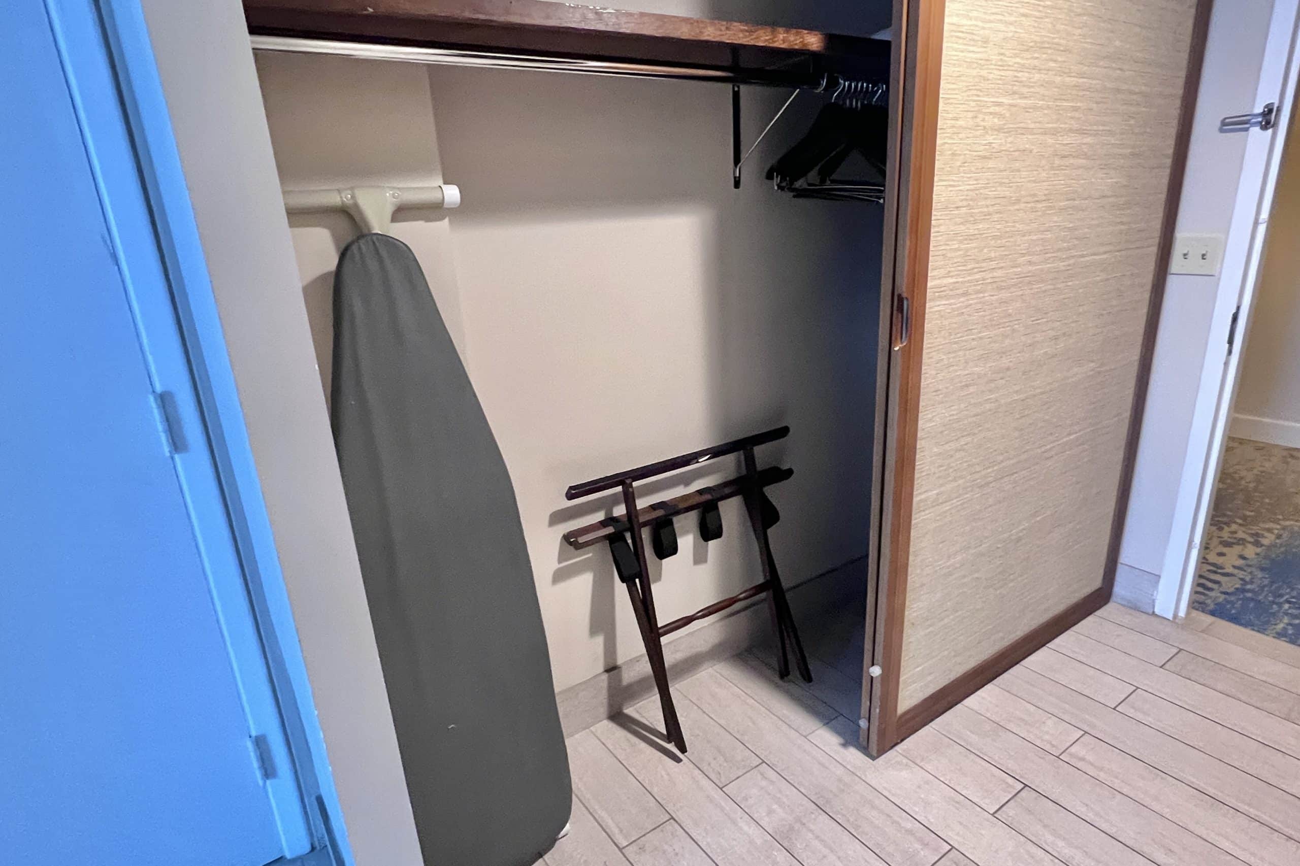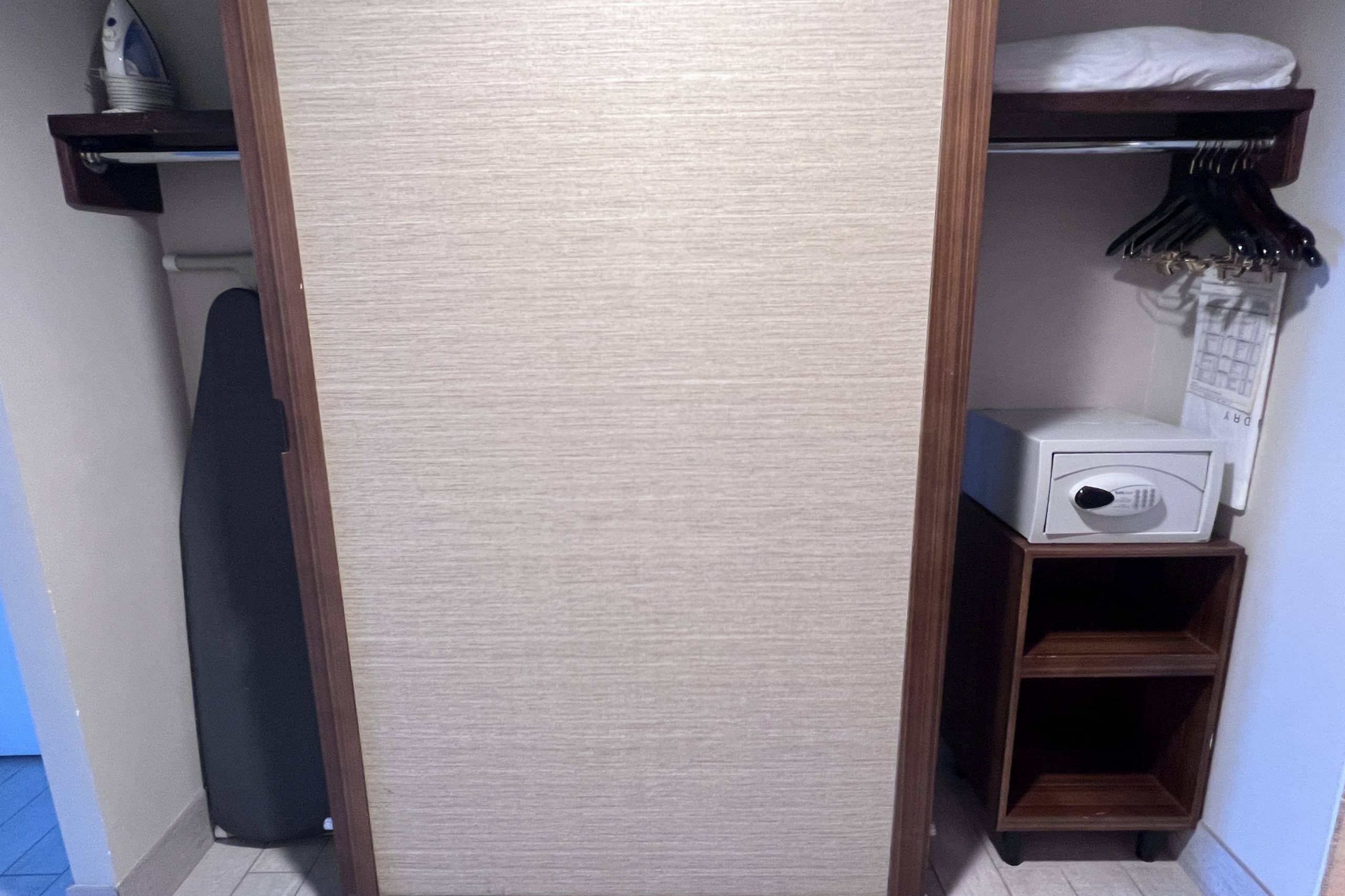 At the entrance was a large closet with a sliding door, and inside were hangers, a safe, an ironing board, and an iron.