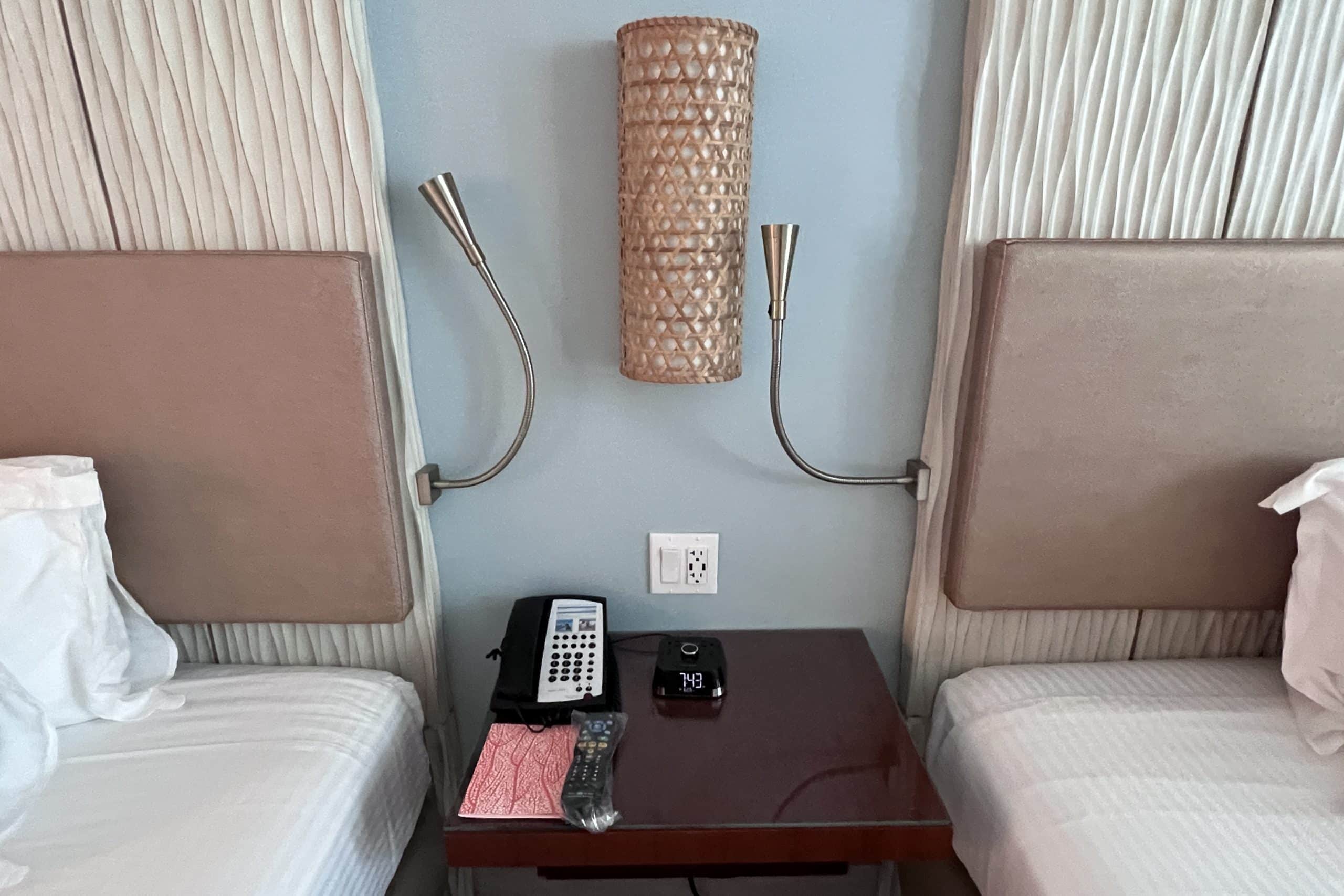 The room had two queen beds with night tables on either side, as well as a side table between with a phone and alarm clock.
