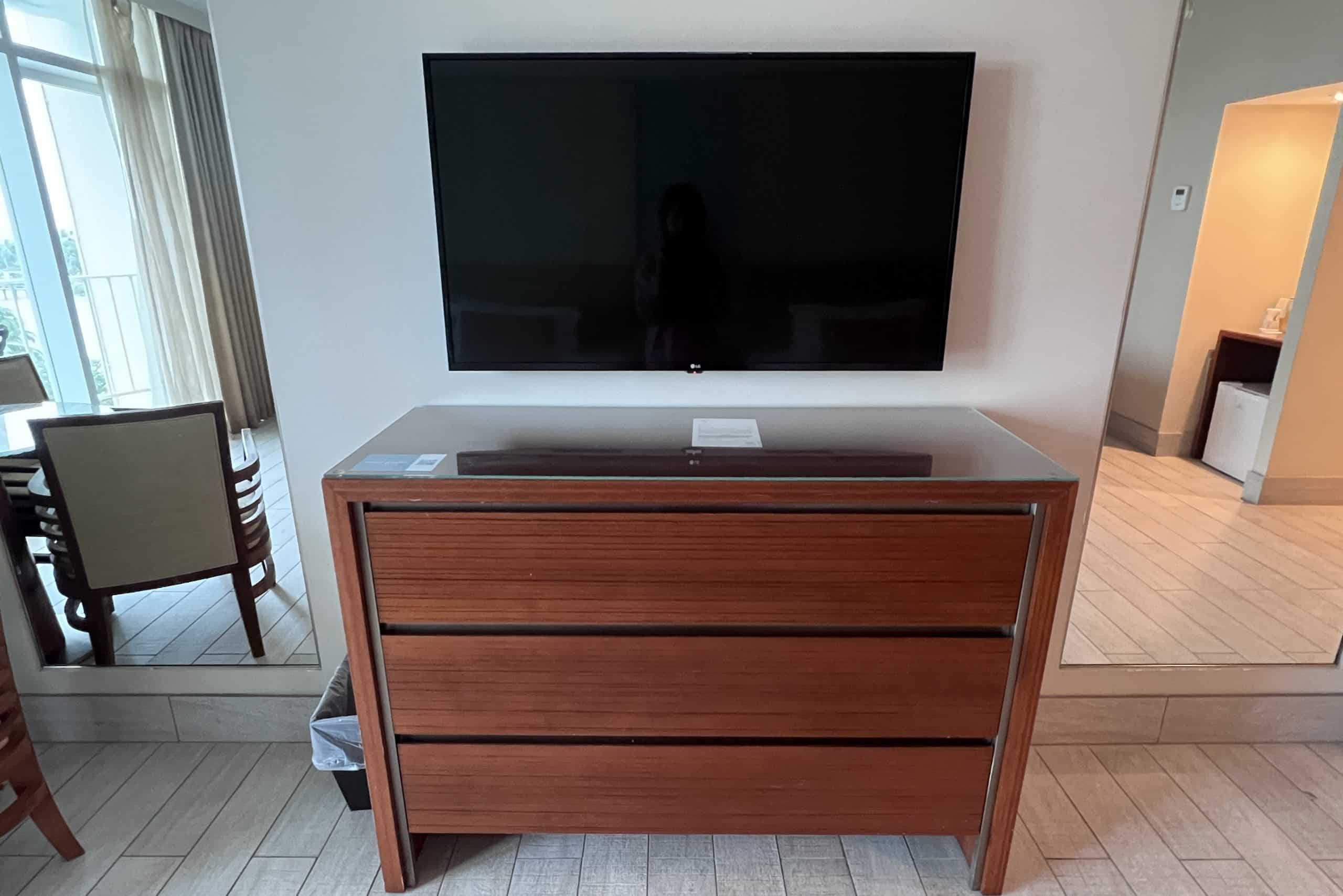 Two floor-to-ceiling mirrors flanked a three-drawer dresser and wall-mounted TV.