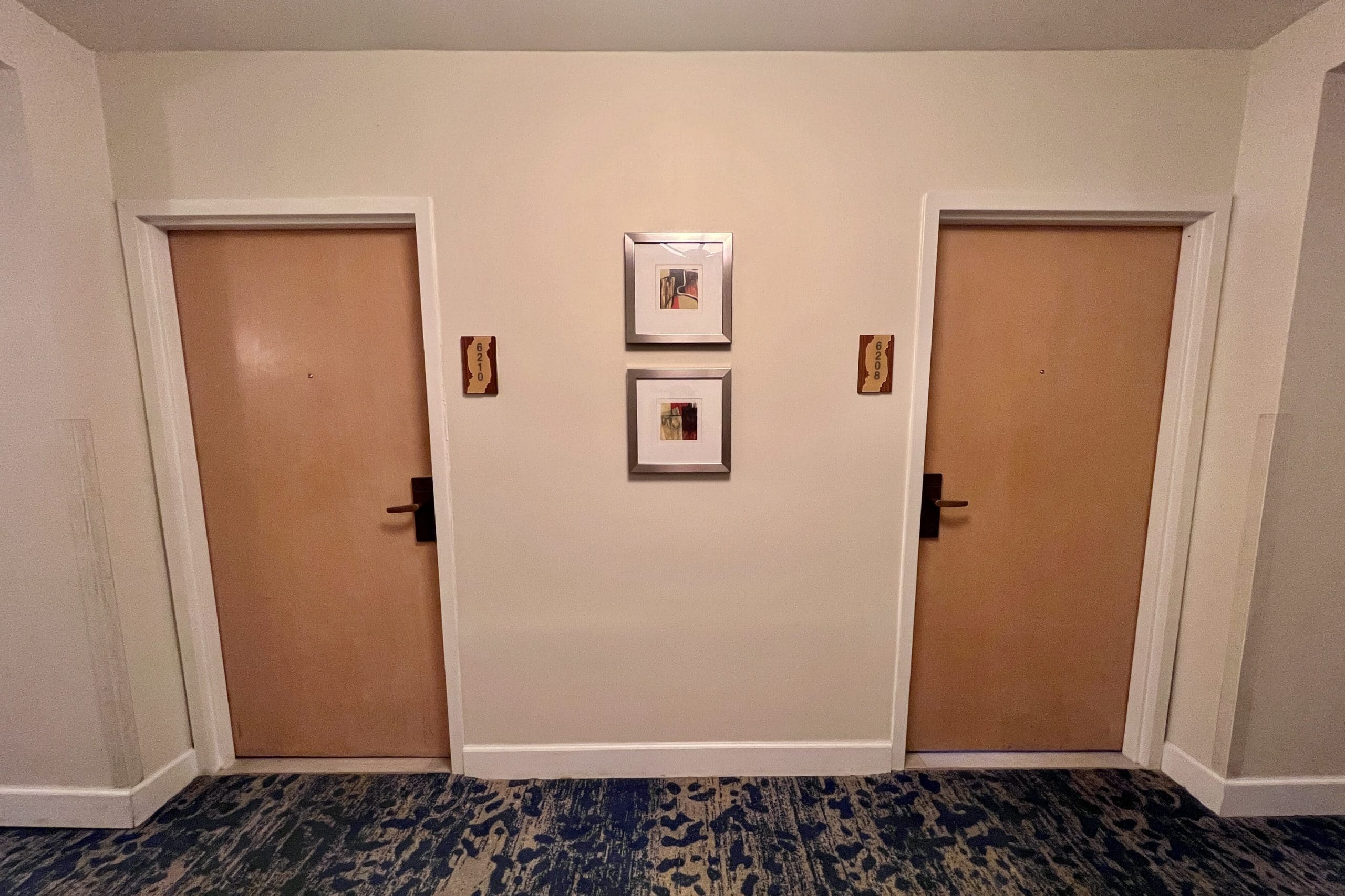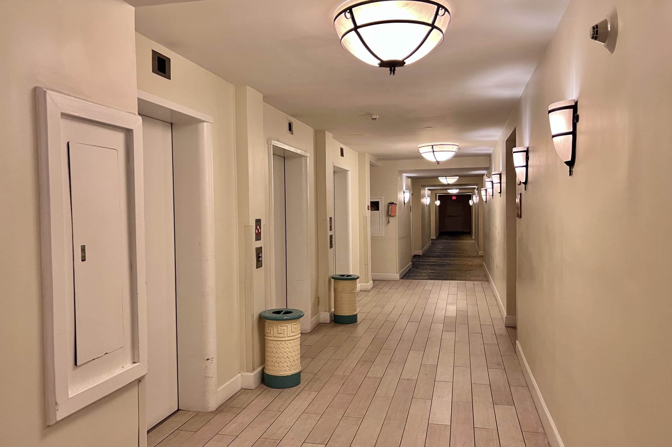 The hallways were carpeted other than the area directly in front of the elevators, which was tiled. The ceilings seemed low, but were probably the standard eight feet. The walls were painted a dull yellowish colour, and the the room doors were made from varnished oak wood.