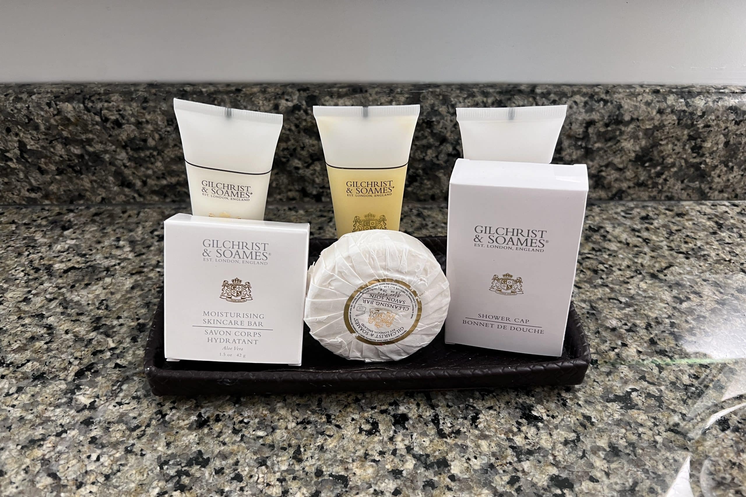 Gilchrist & Soames amenities were provided in the bathroom. The vanity looked a bit dated and there was some rust on the shower curtain bar, but it was otherwise clean.