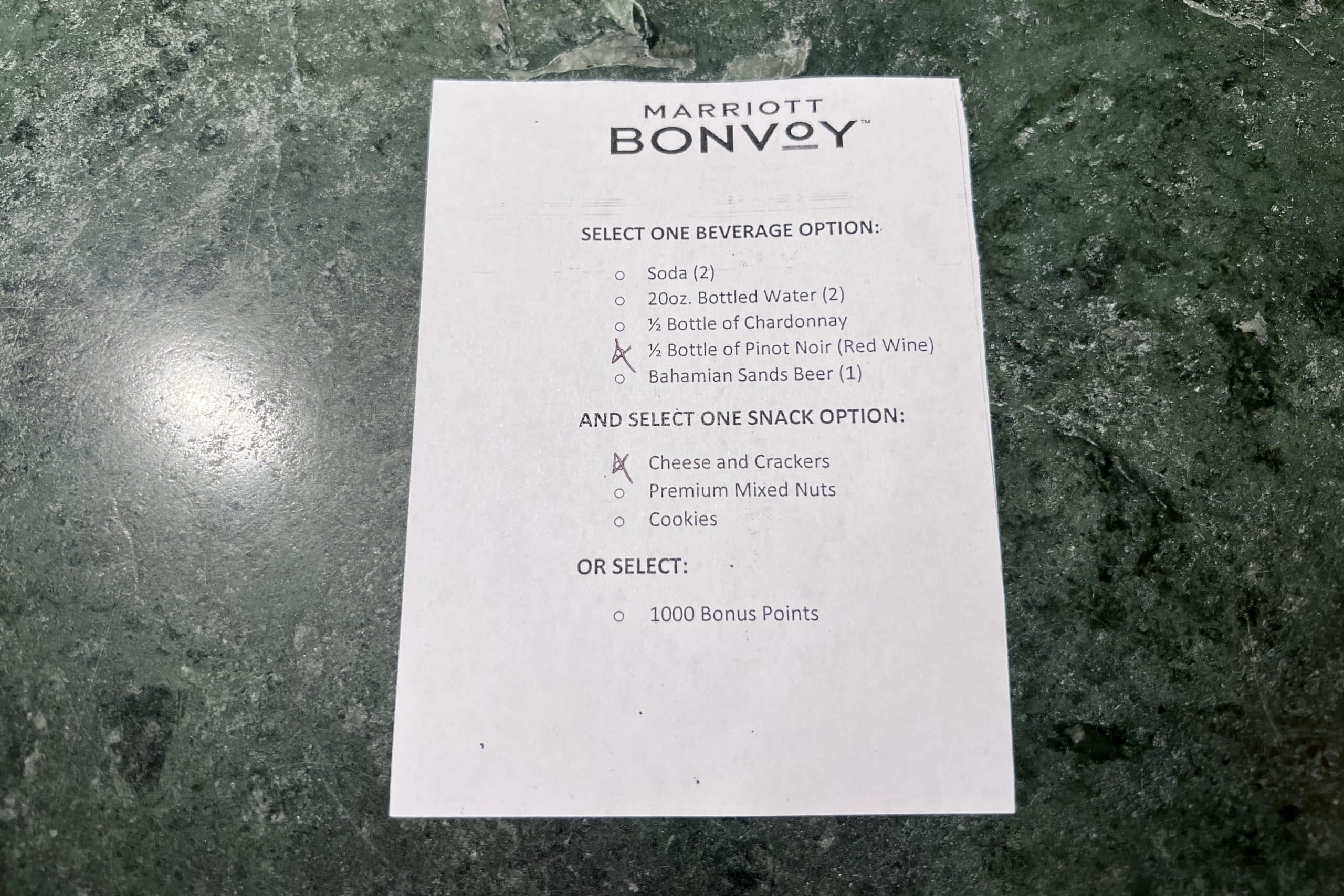When we checked in for my mom, the agent was quick to recognize my elite status, and we were offered a welcome amenity choice of 1,000 points or a snack and beverage choice as outlined in the photo below. Unfortunately, complimentary breakfast is not an option here.