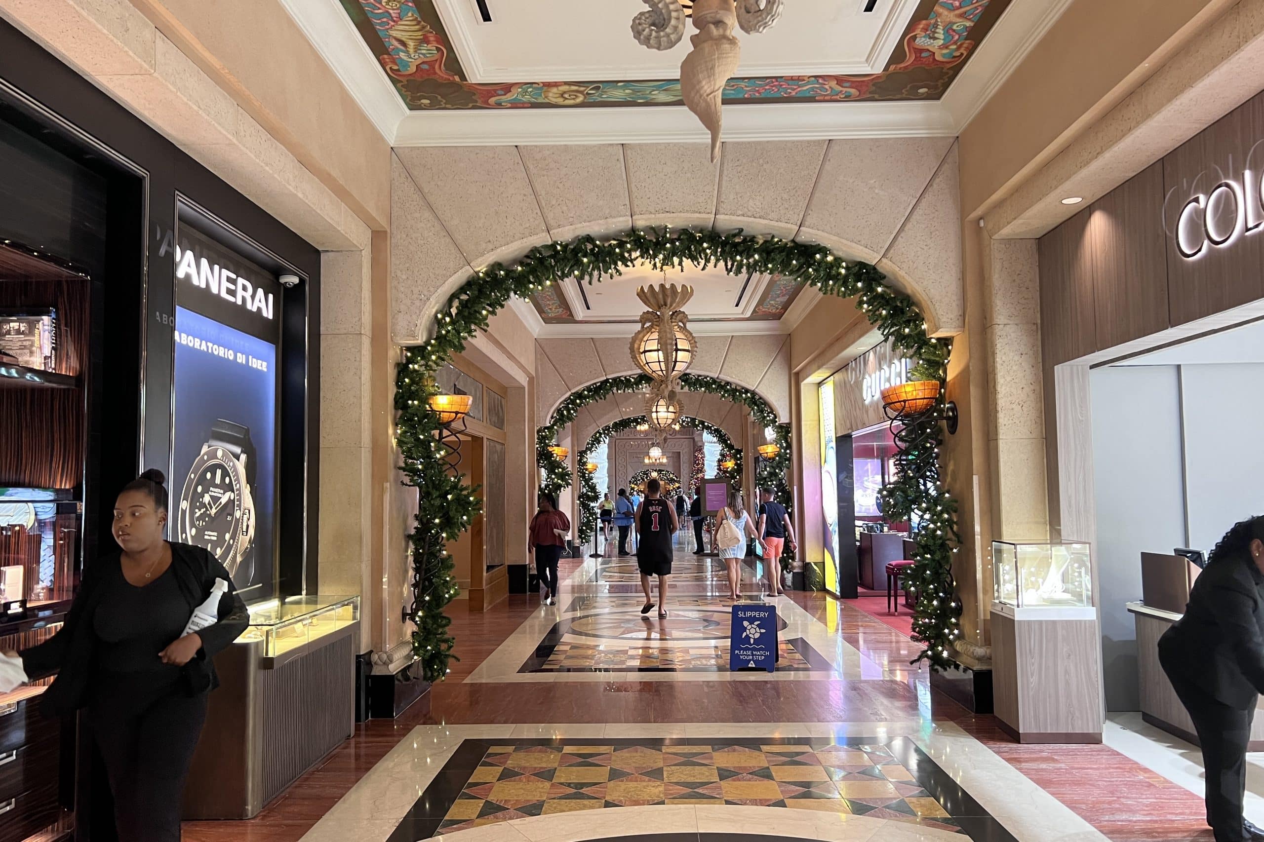 The casino is flanked by a shopping promenade on either side, consisting mainly of high end shops, such as Gucci and Rolex.