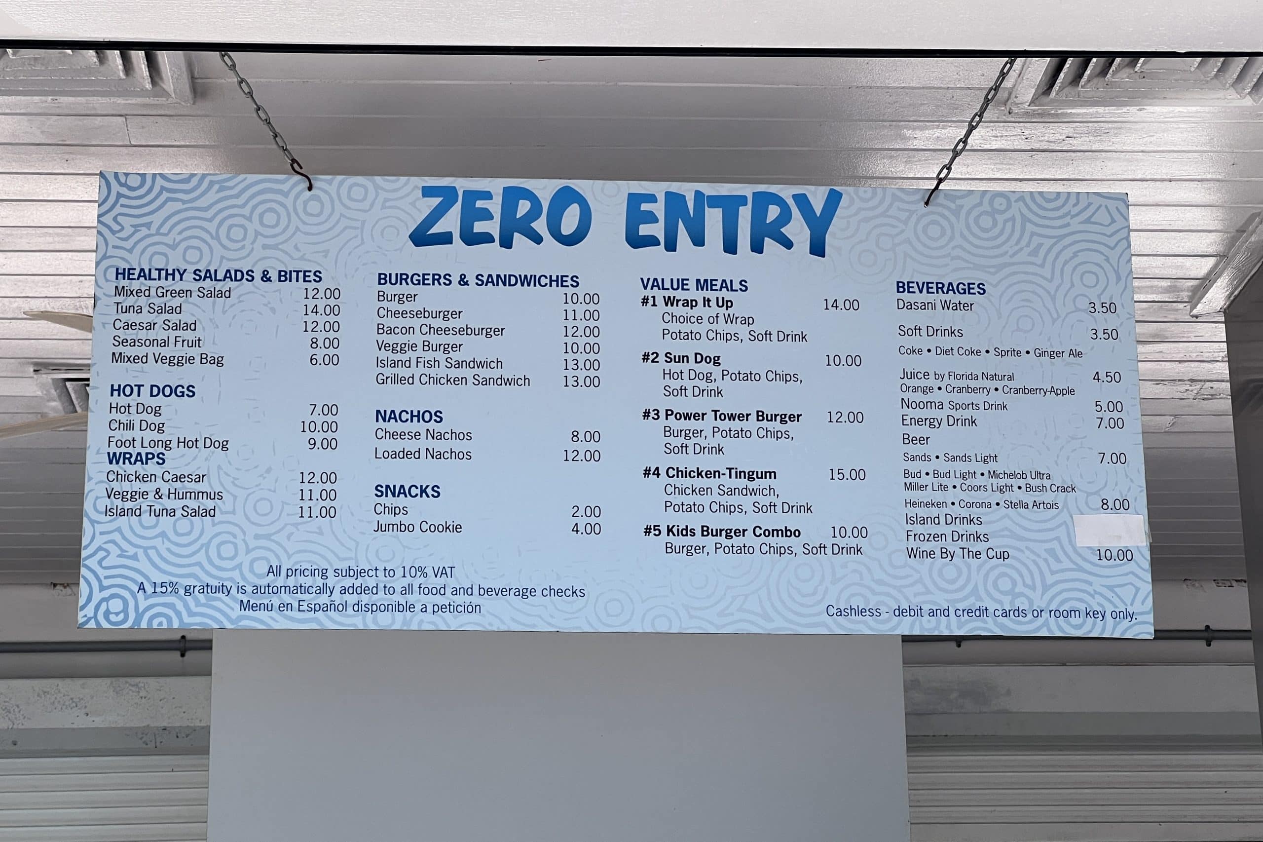 We ate lunch at Zero Entry by the waterpark and beach. By the poolside you can order burgers, wraps, hot dogs, and salads ranging from $7–14 (USD).