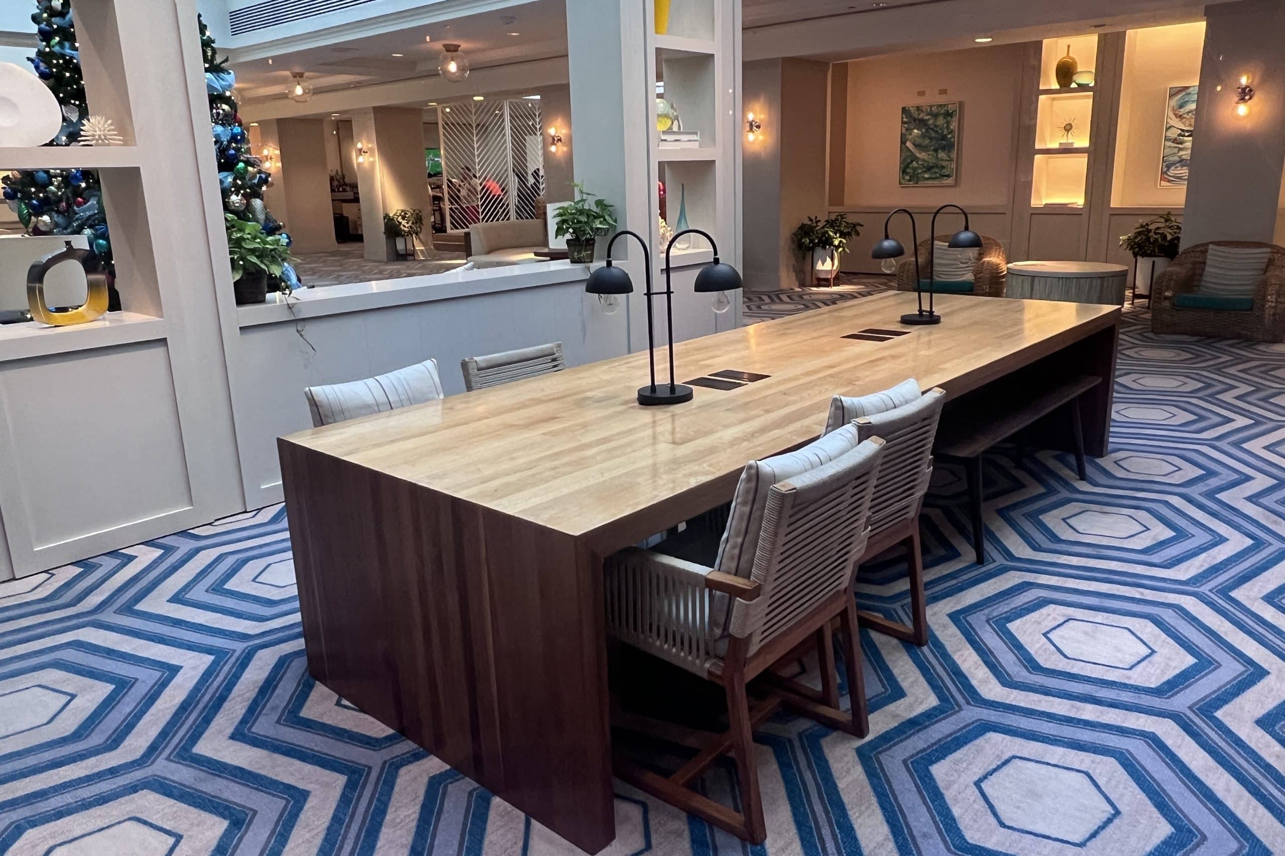 Towards the back of this same area are a couple of work tables as well, with outlets for laptops and table lamps for adequate lighting.