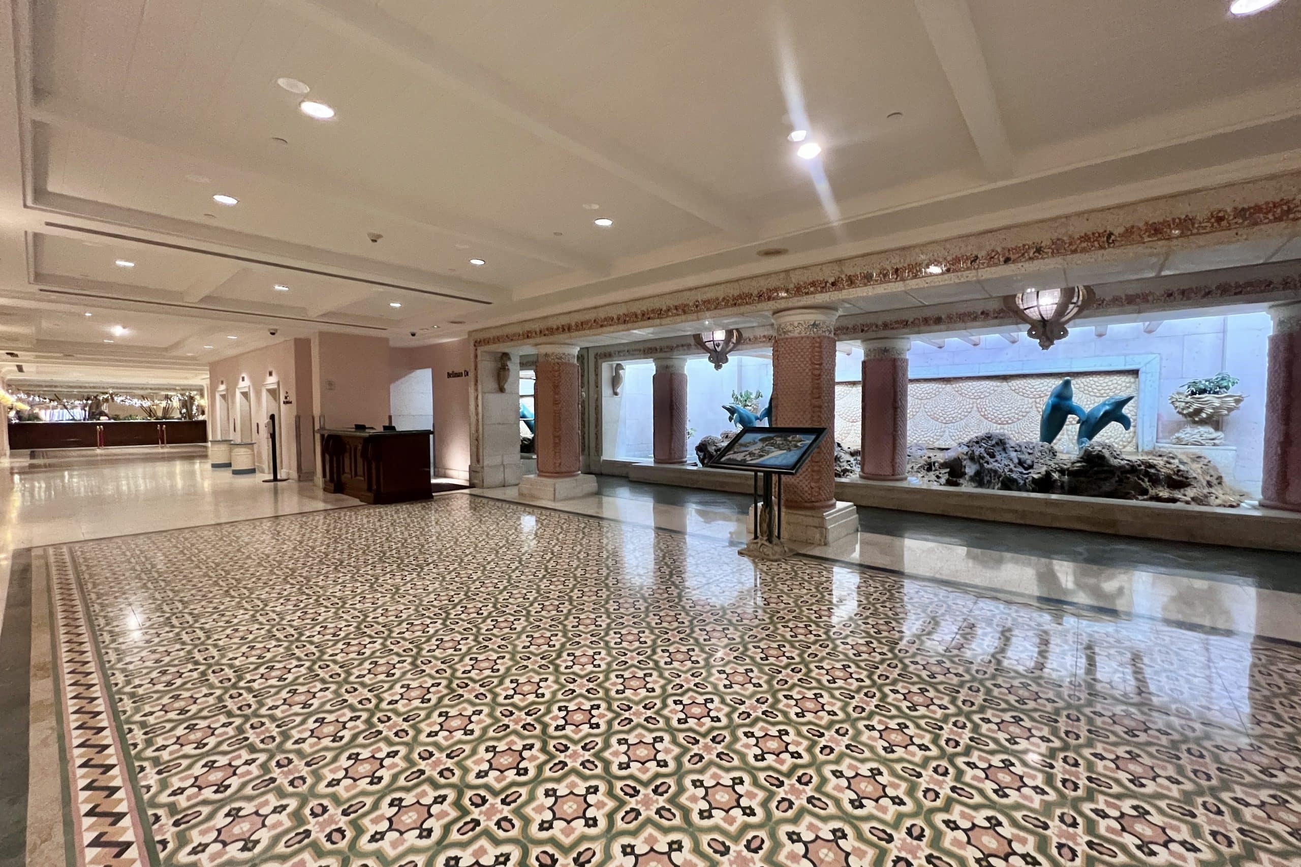 Entering the lobby, we were pleasantly surprised by an open and brightly lit space with mosaic tile flooring. Directly in front of the entrance is a large fountain display, and to the left is the check-in desk.