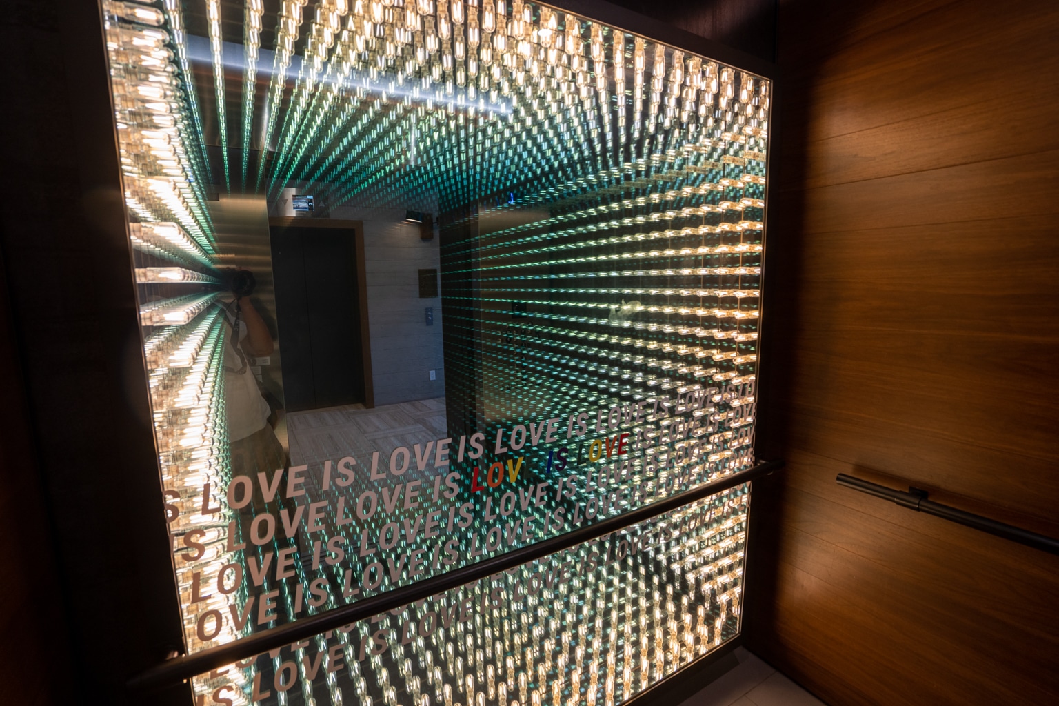 As we headed up towards the room, I noticed an illuminated “love is love” art installation that made for an awesome decoration in the elevator.
