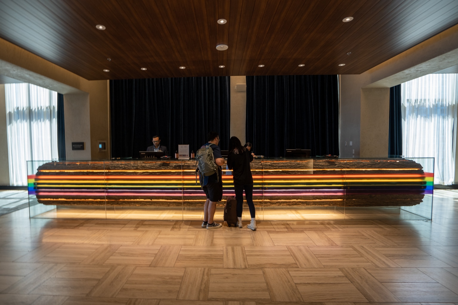 Upon arriving in the lobby, my eyes were immediately drawn to the unique check-in desk, which was fashioned out of a large Douglas Fir tree enclosed in a 25-foot glass box – presumably with a connection to the hotel’s name.
