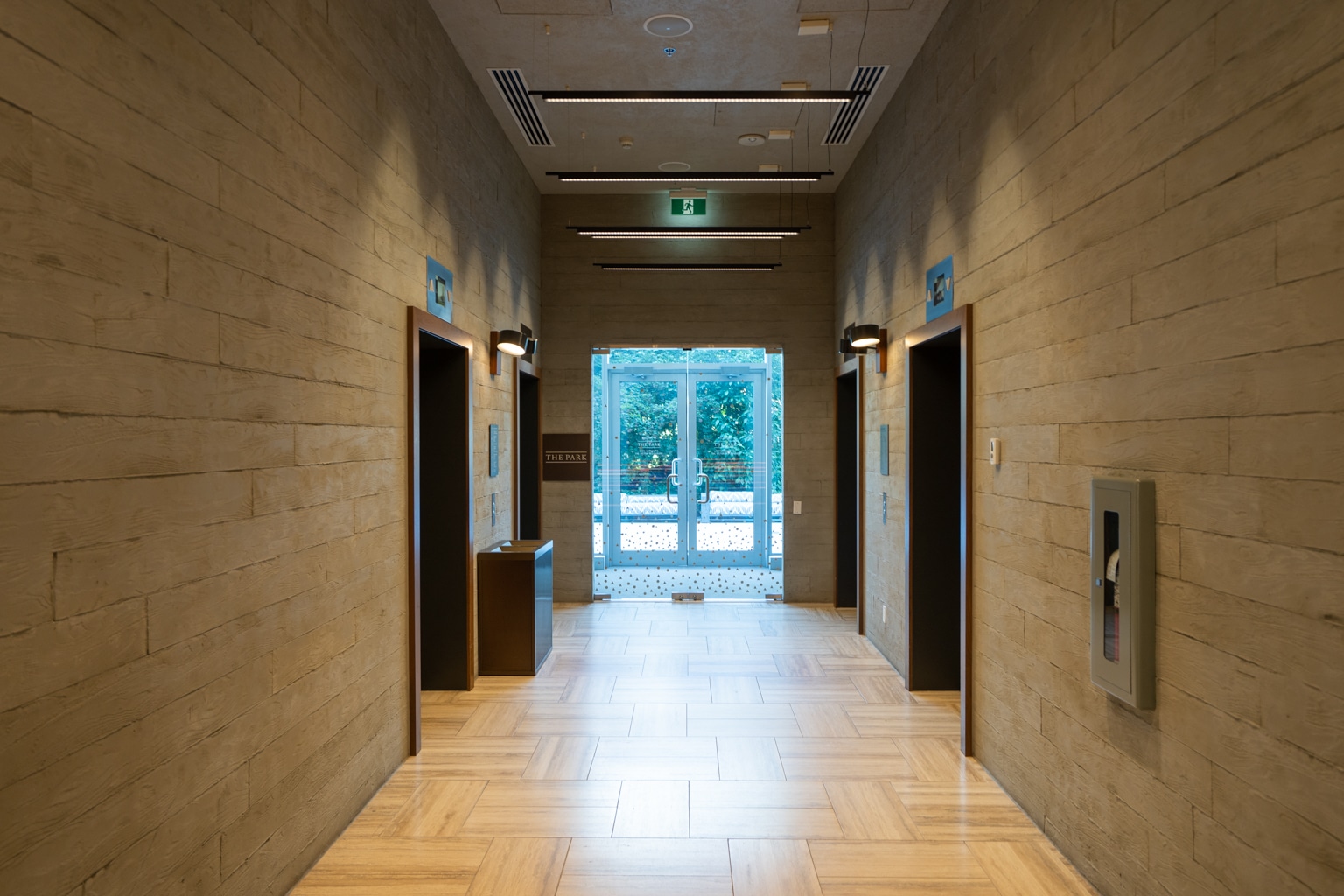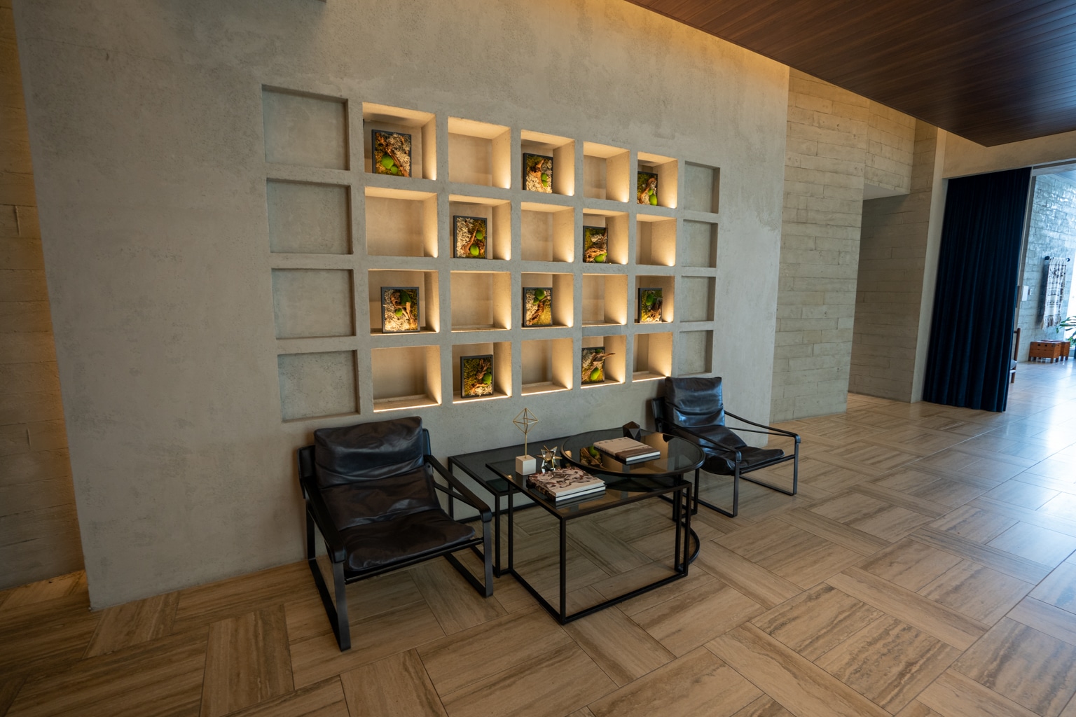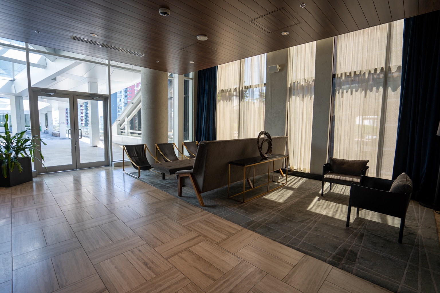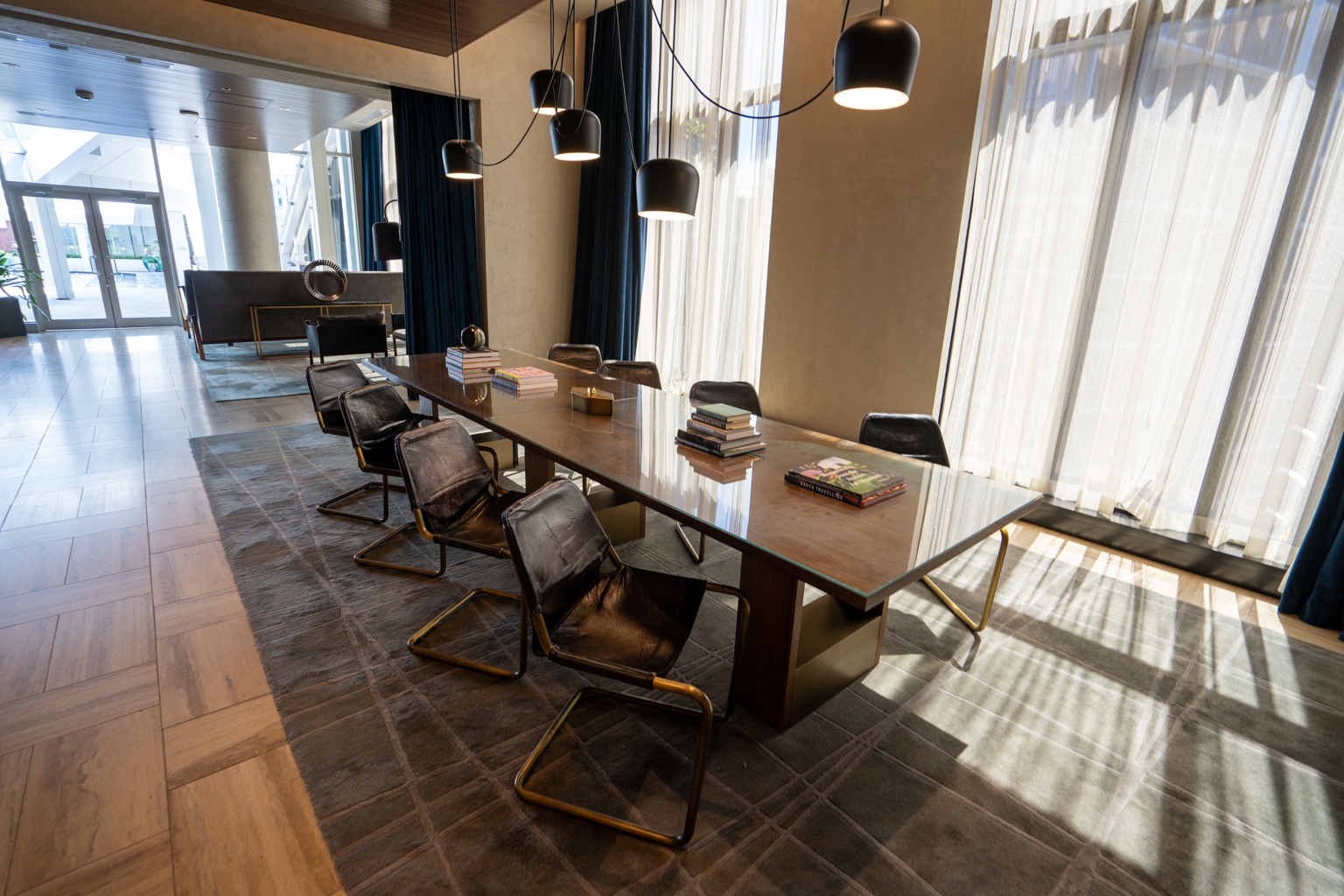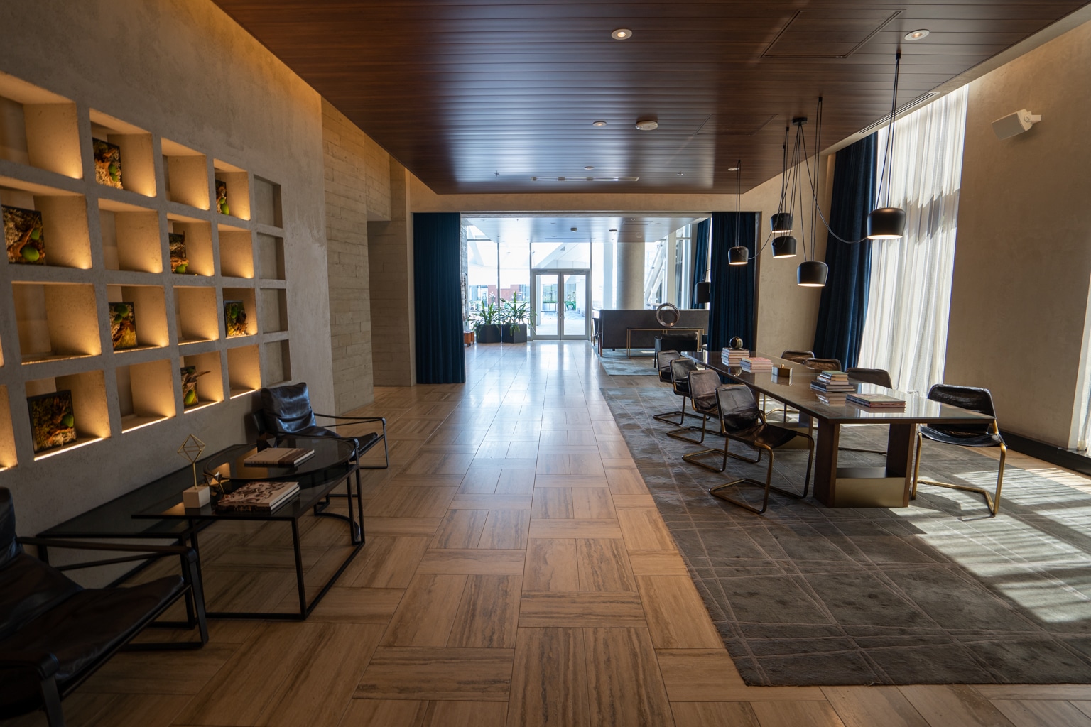 This West Coast-inspired lobby exuded a perfect blend of nature and sophisticated city life, with wooden features and beautiful light fixtures spread throughout.
