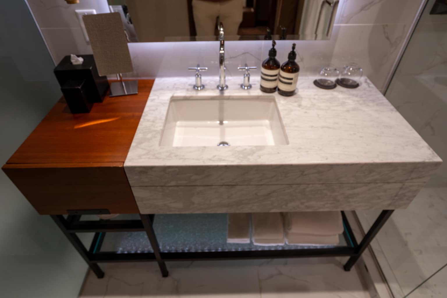 The bathroom was nicely appointed and decorated, and continued the urban and earthly theme with a vanity made of wood and marble.