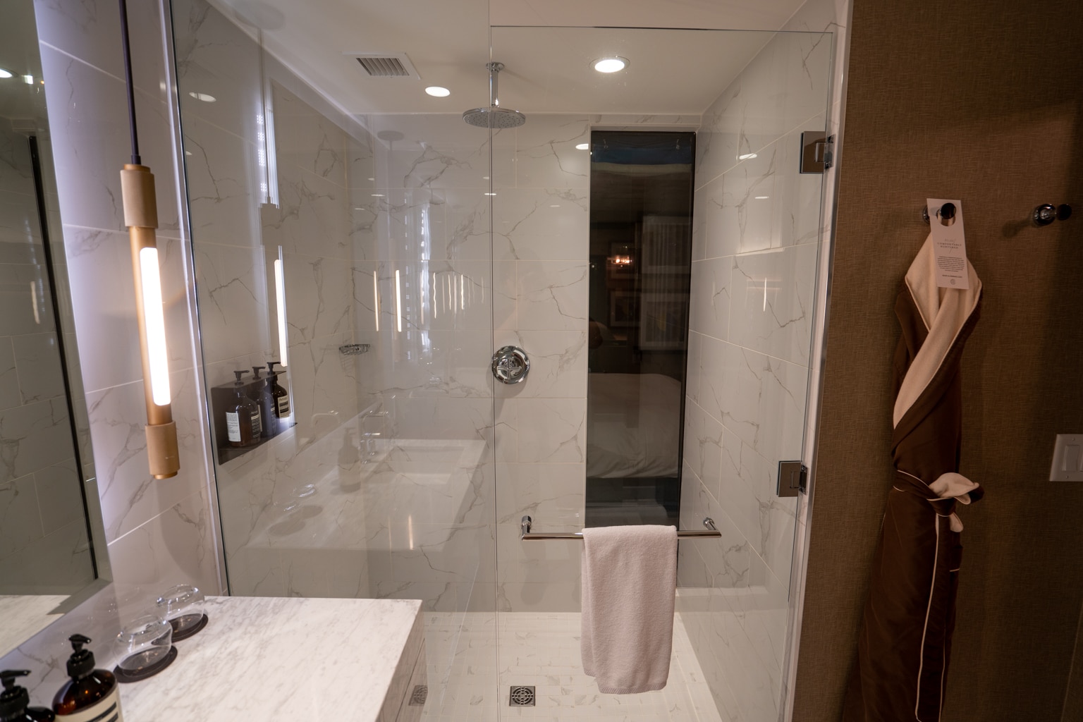 The shower area was large and well-lit, with marble designs along the walls. It had a window pane between the shower and the bedroom, which I also thought was a creative touch.